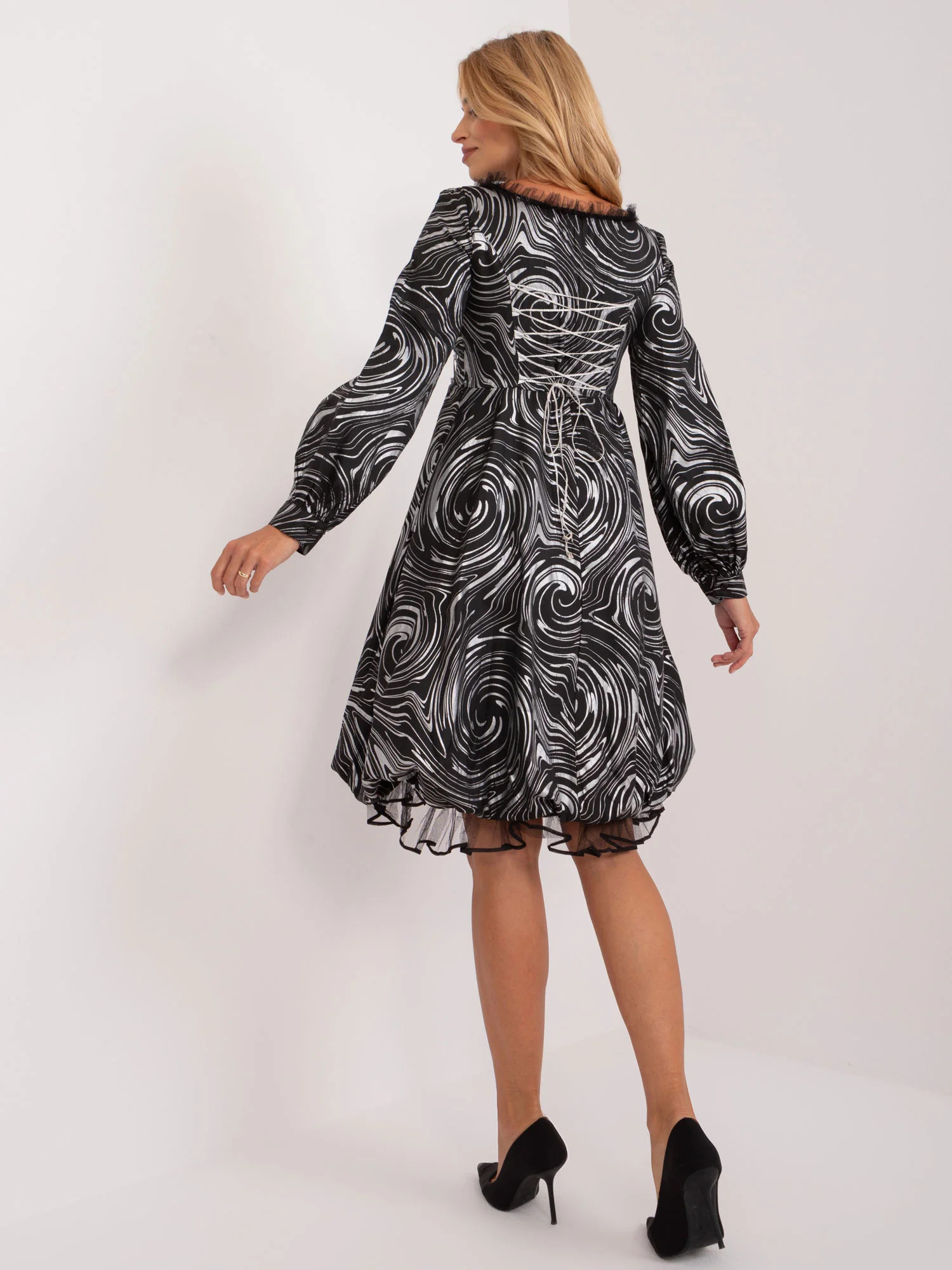 Modelka má na sobě velikost S/M. Rozměry modelky: výška 175 cm, poprsí 90 cm, pas 66 cm, boky 94 cm.