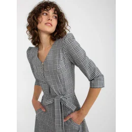 Bílé a černé kostkované midi koktejlové šaty s páskem .