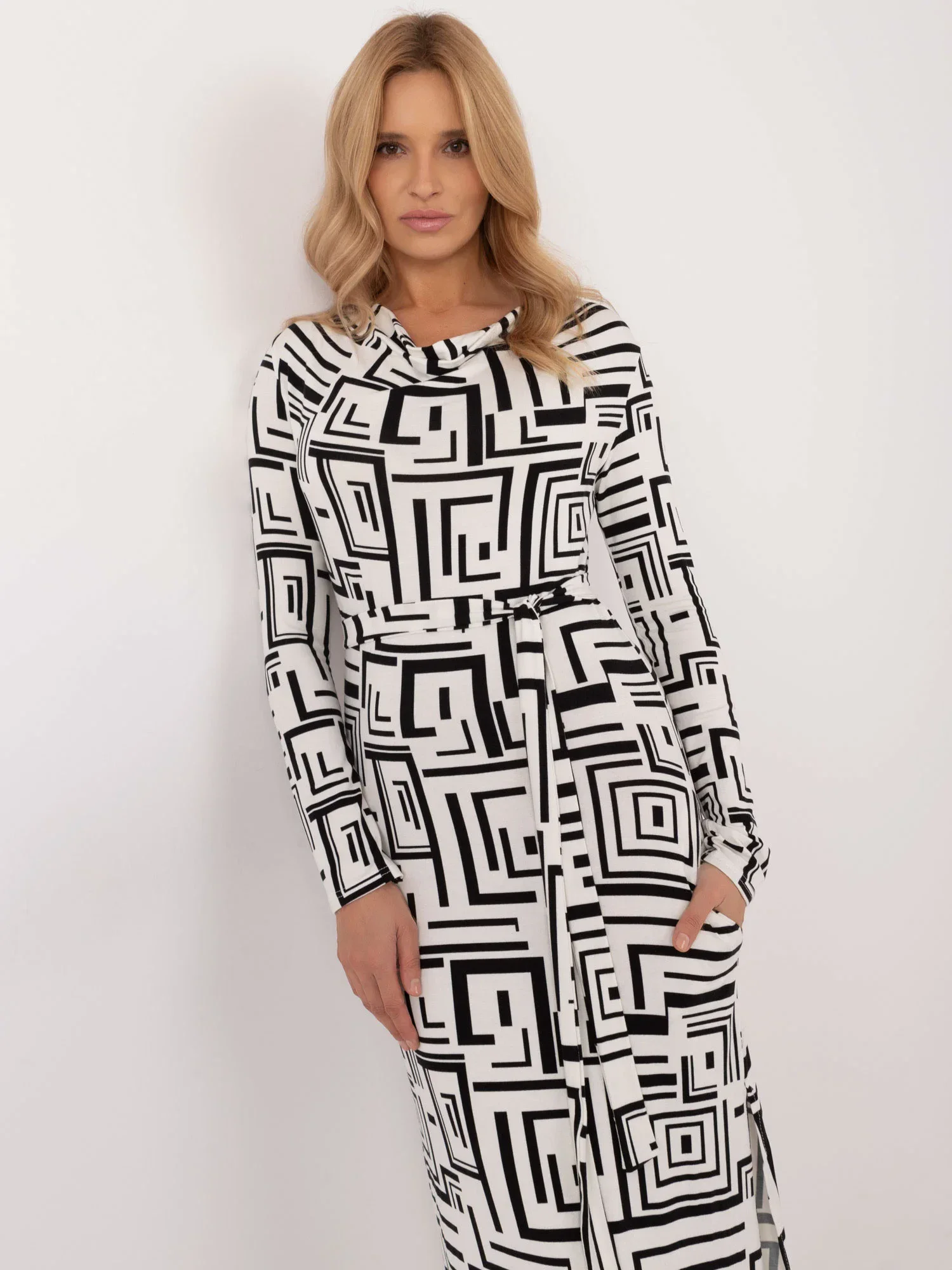 Modelka má na sobě velikost S/M. Rozměry modelky: výška 175 cm, prsa 90 cm, pas 66 cm, boky 94 cm.