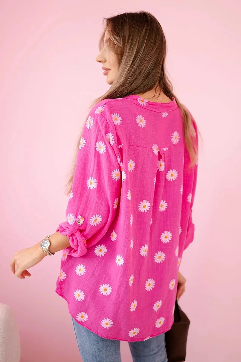 Lněná dámská halenka s květinovým vzorem, dlouhými rukávy a knoflíky Růžová