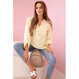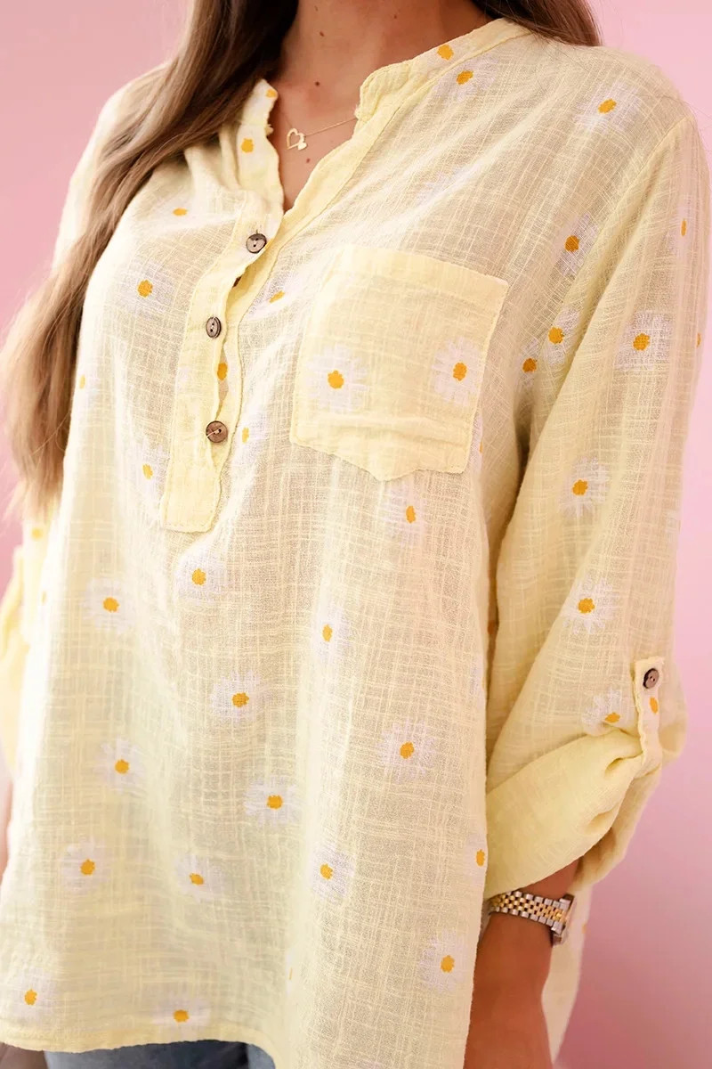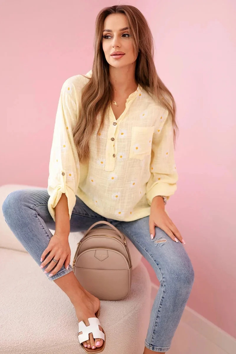 Lněná dámská halenka s květinovým vzorem, dlouhými rukávy a knoflíky Žlutá
