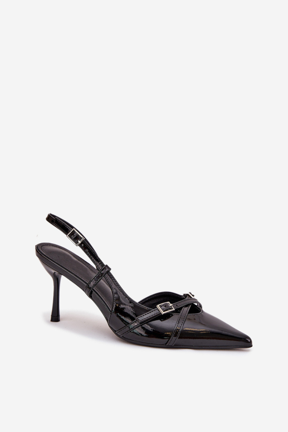 Dámské lodičky s odkrytou patou na jehlovém podpatku jsou skvělým návrhem pro speciální příležitosti. Vepředu mají dva zkřížené popruhy zdobené malými sponami, které jim dodávají jemný šarm. Špičaté špičky prodlužují nohy, dodávají postavě štíhlost a eleganci. Ideální na večerní výlety, svatby nebo jiné slavnostní události.