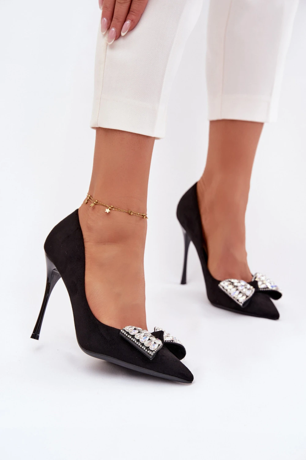 Elegantní dámské podpatky vyrobené z ekologického semiše jsou velmi elegantní model, který přitahuje pozornost jemnými detaily. Jemná mašle umístěná vpředu na botě, zdobená třpytivými krystaly, jim dodává šperkovní kouzlo. Tenké, špičaté špičky zdůrazňují ženskou linii nohy a dodávají obuvi klasický, elegantní charakter. Ideální na speciální příležitosti, kdy chcete vypadat stylově a elegantně.