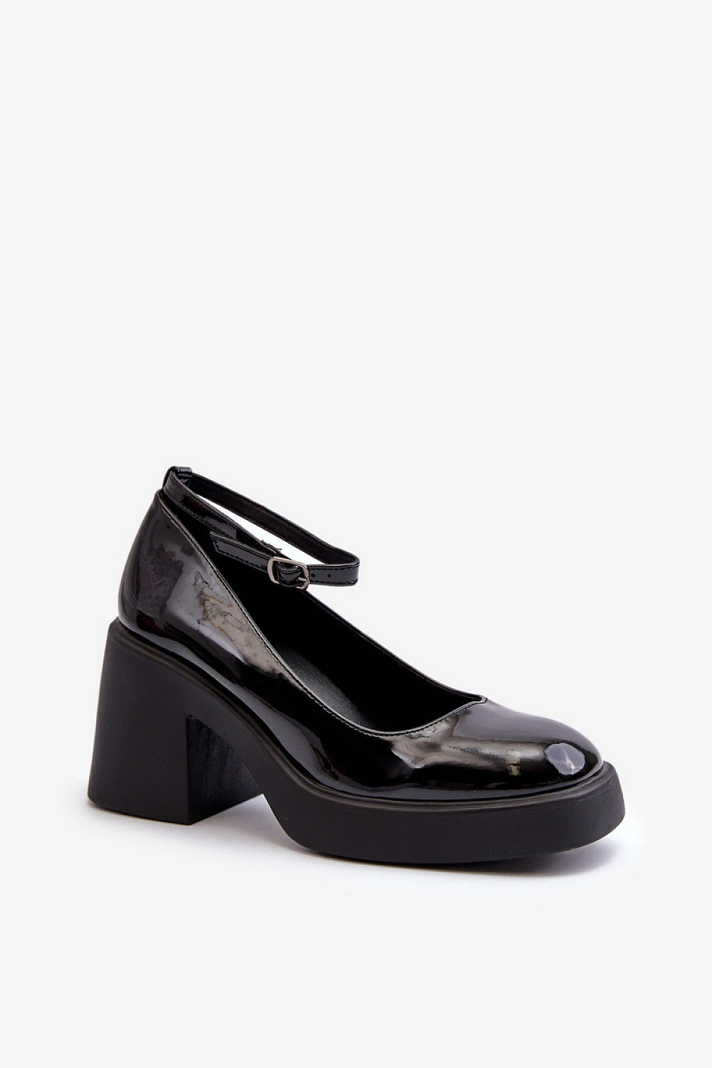 Jedinečné lodičky vyrobené z ekologické kůže. Zapínající se na nastavitelný pásek se sponou, co zajišťuje ideální přizpůsobení noze. Umístěné na masivním, vyšším podpatku ve tvaru kostky. Peta je zpevněná a špička čtvercová. Navíc mají boty jemnou platformu.