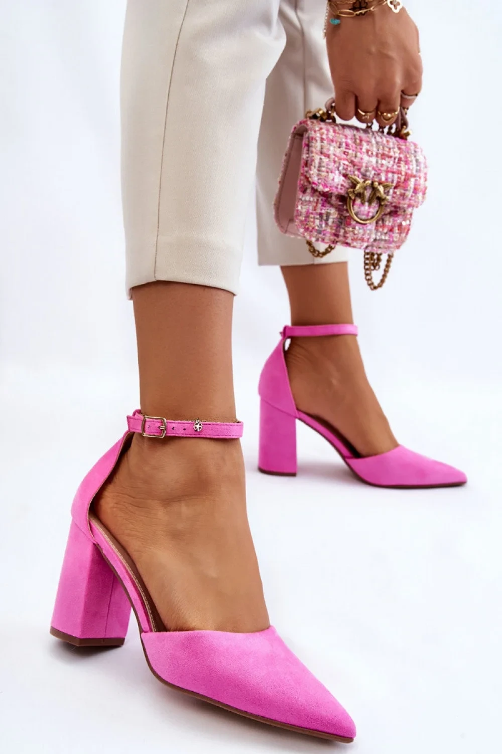 Klasické lodičky se špičatou špičkou byly vyrobeny z ekologického semiše. Zapínají se kolem kotníku na přezku a nastavitelný pásek. Měkká stélka z ekokůže zajišťuje vysoký komfort používání. Lodičky jsou posazeny na jehlovém podpatku. Skvěle se hodí k šatům, elegantním kalhotám nebo džínům.