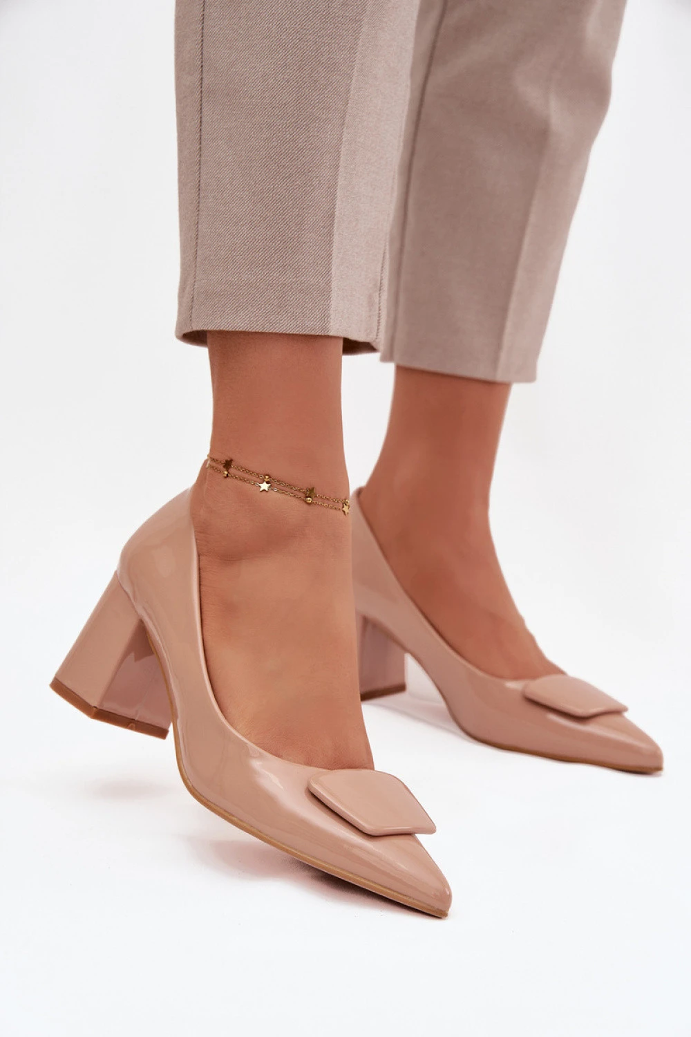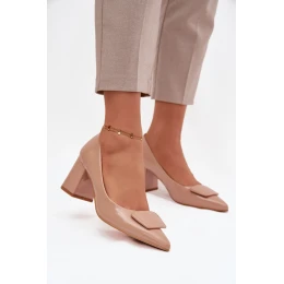 Tříčtvrteční dámské lodičky z ekokože jsou klasickým návrhem, který spojuje nadčasovou eleganci s pohodlím nošení. Model na stabilním sloupkovém podpatku poskytuje pohodlí po celý den, a špičaté špičky opticky prodlužují nohy, zdůrazňujíce ženský charakter. Vepředu je ozdobný detail. Jsou to ideální lodičky pro elegantní stylizace, skvěle se hodí jak do práce, tak na speciální příležitosti, skvěle ladí s šaty, sukněmi a klasickými kalhotami.