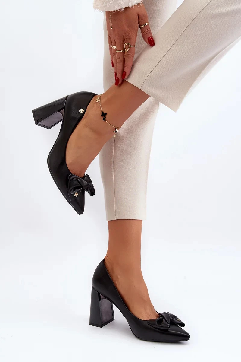 Elegantní lodičky se stabilním blokovým podpatkem jsou perfektní volbou pro mnoho příležitostí. Vyrobeny s důrazem na detail, mají měkkou a pohodlnou vložku z přírodní kůže, která zajistí pohodlí i při dlouhodobém nošení. Jejich špičaté špičky dodávají styl a jemný emblém po stranách svršku jim dodává sofistikovaný charakter. Přední strana zdobená mašlí. Tento model skvěle doplní každodenní i elegantní styly! Při výběru velikosti se řiďte tabulkou velikostí.