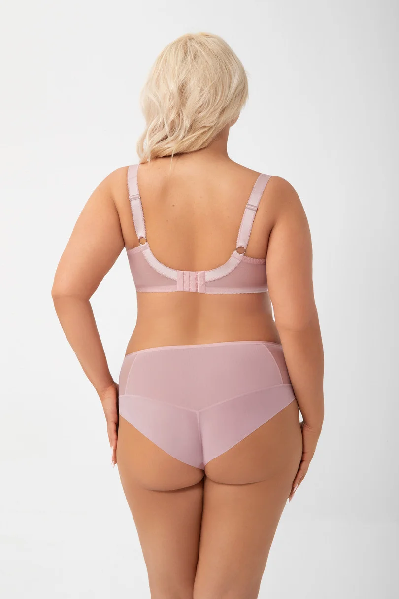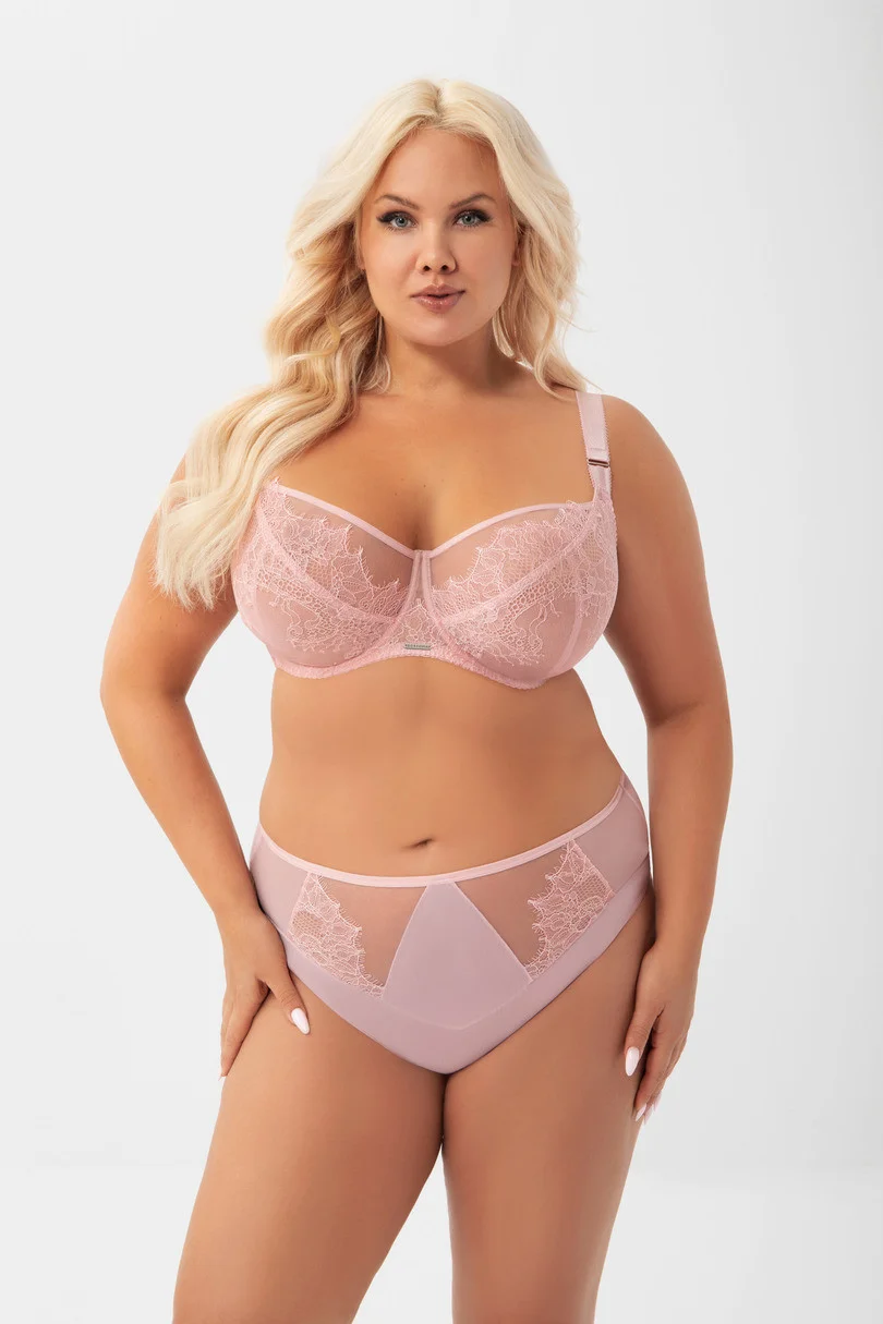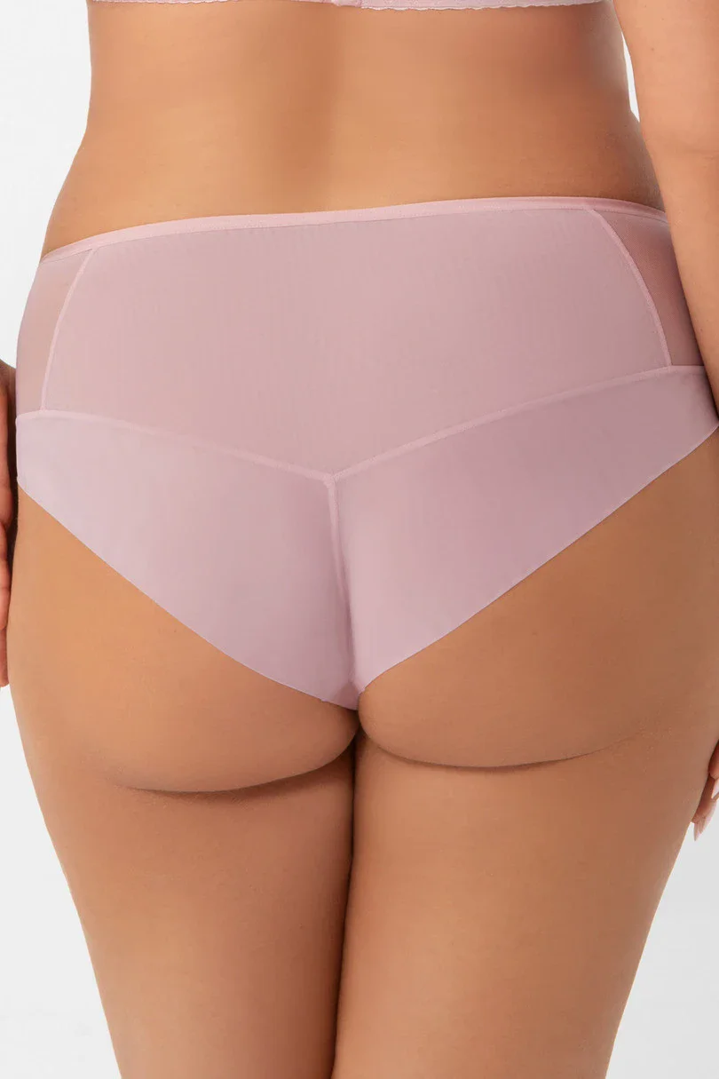Wyższy stan. Zabudowany fason zasłaniający prawie całe pośladki. Wykonane z tiulu elastycznego z koronkowymi elementami na tiulu stabilnym.Ozdobne przeszycia metaliczną nitką. Tył z tiulu elastycznego wykończony na gładko, tak aby majtki nie odznaczały się pod ubraniem. Bawełniany kroczek