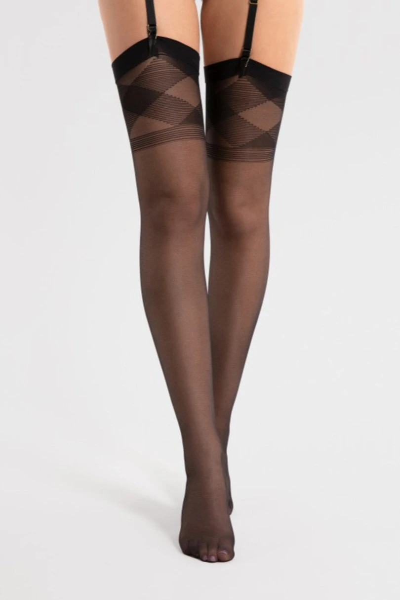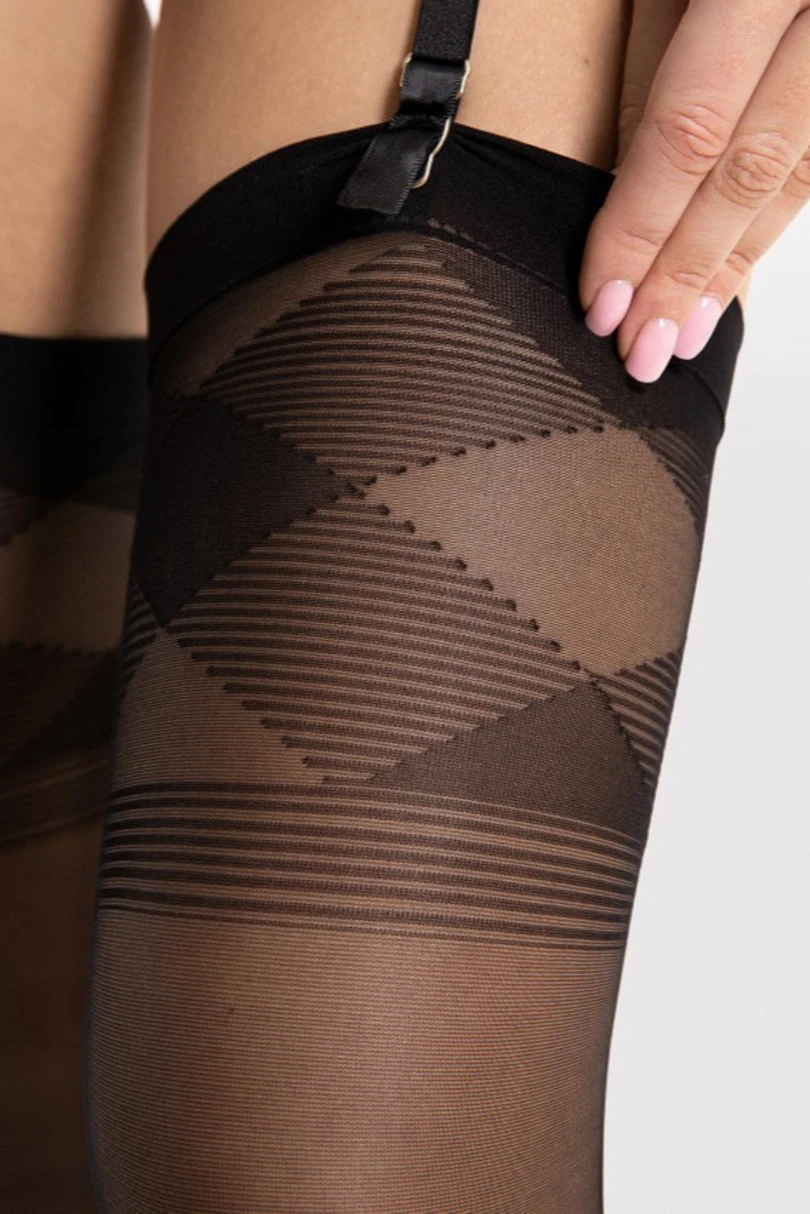 Pończochy do paska LOSAGNE 20 DEN marki Fiore to elegancka propozycja dla kobiet, które cenią nowoczesny design połączony z klasyczną zmysłowością. Model wyróżnia się geometrycznym, wzorzystym motywem, który subtelnie zdobi nogi i nadaje stylizacji wyrafinowanego charakteru. Półtransparentna struktura materiału pięknie podkreśla kształt nóg, optycznie je wysmuklając. Grubość 20 DEN sprawia, że pończochy są lekkie i komfortowe, idealne zarówno na wyjątkowe okazje, jak i eleganckie wieczorne stylizacje. Wysoka zawartość poliamidu oraz elastanu zapewnia doskonałe dopasowanie, elastyczność i trwałość. Model LOSAGNE jest przeznaczony do noszenia z paskiem, co podkreśla jego klasyczny, bieliźniany styl i dodaje całości wyjątkowej kobiecości. To doskonały wybór dla kobiet poszukujących pończoch o modnym wzorze i najwyższejEAN čárové kódy zboží jsou:
