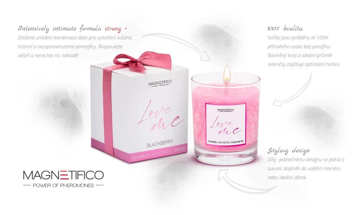 Lidé při výběru partnera podvědomě reagují na onu pověstnou "chemii". Afrodiziakální svíčky Love me ze série Magnetifico power of pheromones jsou navrženy tak, aby se speciální parfém uvolňoval přirozeně v závislosti na okolních teplotách místnosti a to i při nehořící svíčce. Zesílená Intensively Intimate formula strong + nenechá nic náhodě, působí podvědomě na vaše smysly a pomůže vám naladit nezapomenutelnou atmosféru nejen při vašich intimních chvílích. Je navržena tak, aby vám pomohla vytvořit tu správnou afrodiziakální atmosféru pro svádění, relaxaci a milování.
