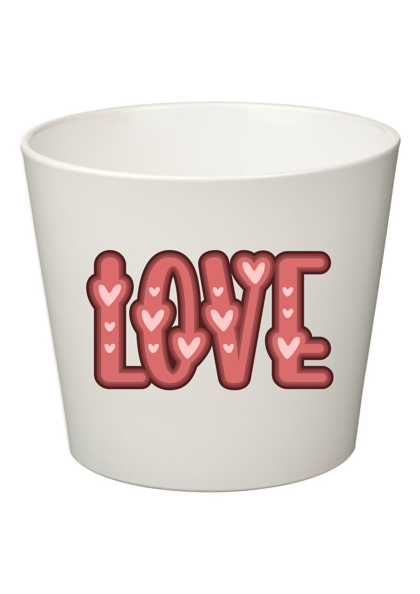 Elegantní bílý květináč s minimalistickým nápisem „LOVE“ je stylovým doplňkem do každého interiéru. Jednoduchý, ale výrazný motiv symbolizuje lásku, harmonii a pozitivní energii, díky čemuž se skvěle hodí nejen jako dekorace, ale i jako milý dárek pro někoho blízkého.