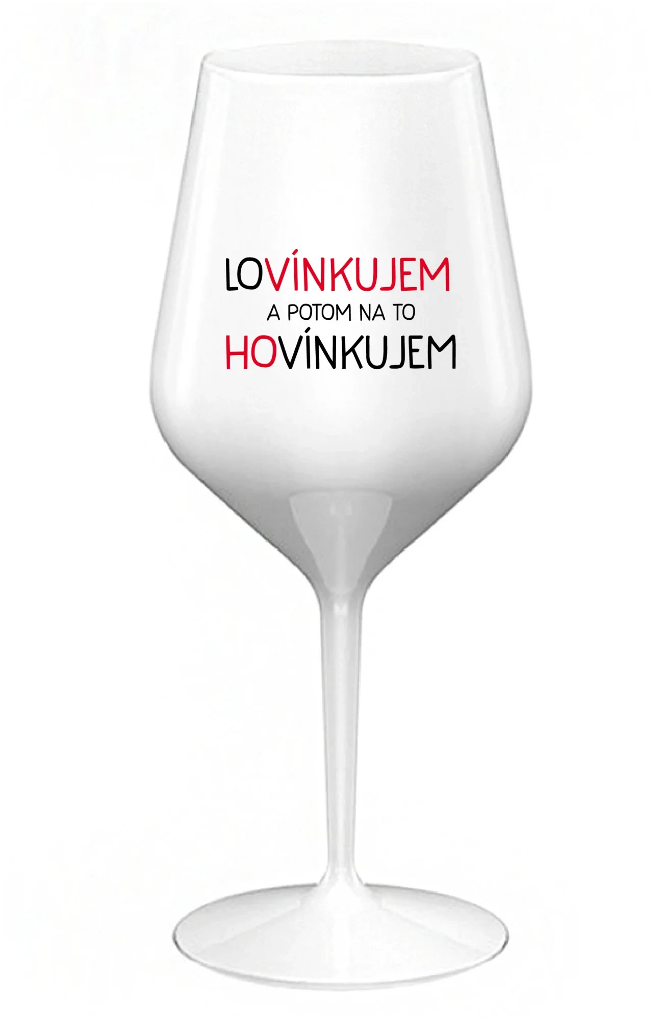 LOVÍNKUJEM A POTOM NA TO HOVÍNKUJEM - biely nerozbitný pohár na víno 470 ml