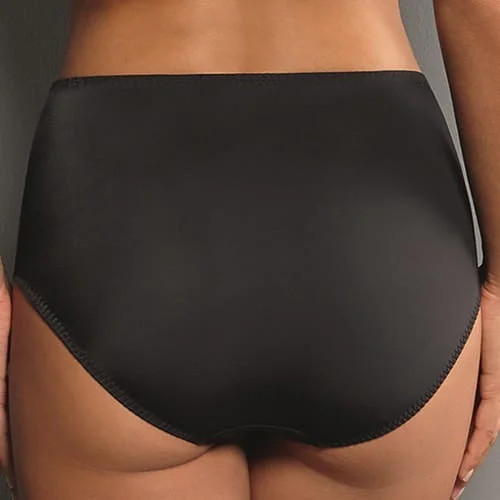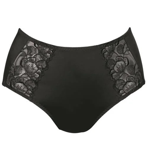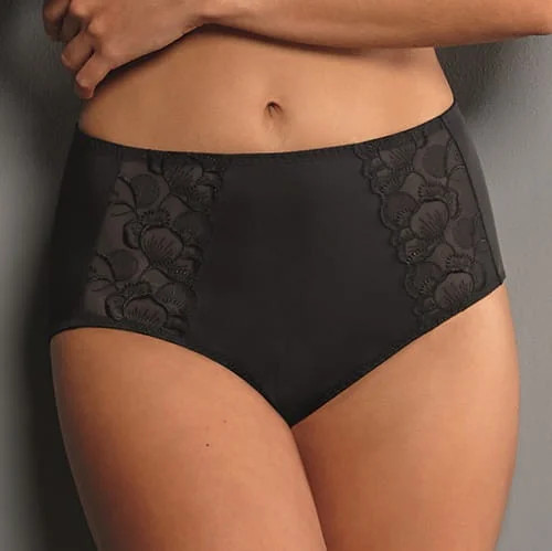 Vysoké, plné kalhotky Anita s nejvyšším komfortem nošení. Širší boky dokonale přiléhají a zadní část perfektně drží hýždě. Na bocích vyšívané květinové vsadky na průsvitném tylu.
