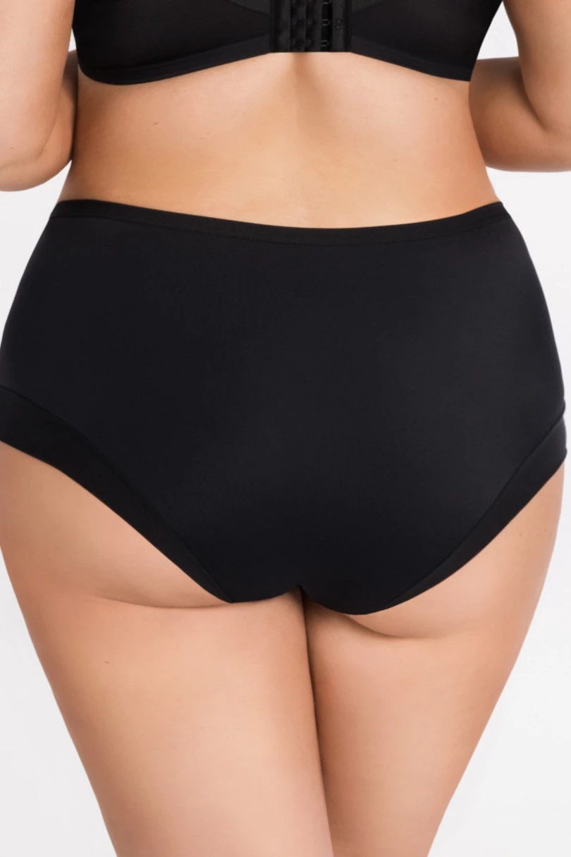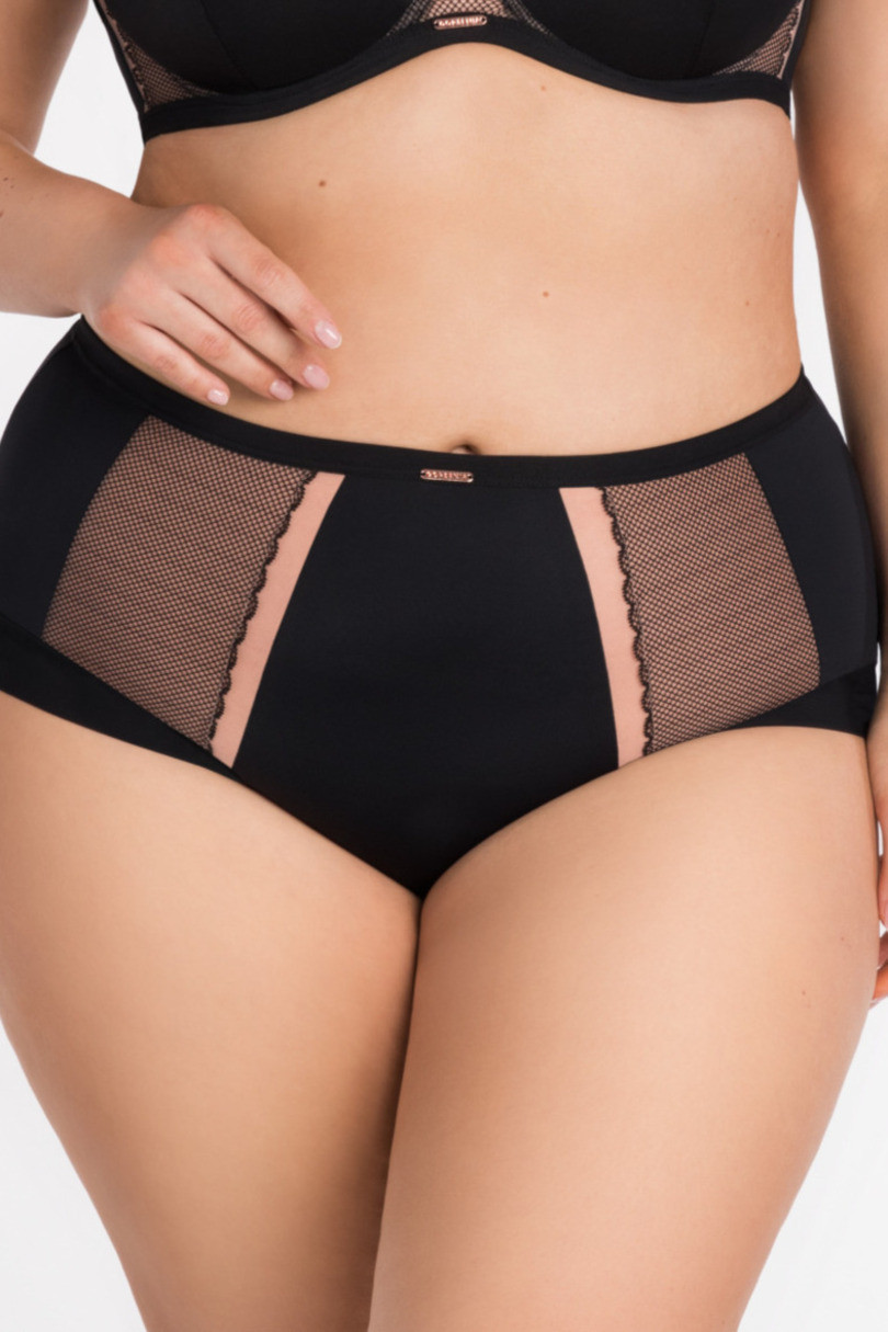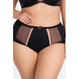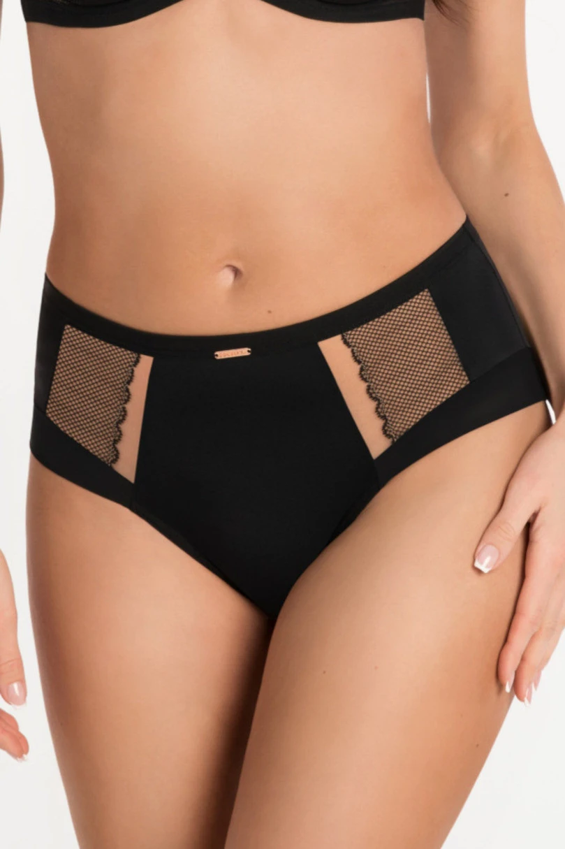 Figi damskie w kolorze czarnym, wykonane w wygodnym, bardziej zabudowanym fasonie zapewniającym stabilne dopasowanie i dobre krycie. Centralna część z przodu i z tyłu jest gładka, z miękkiego materiału, który komfortowo układa się na ciele i pozostaje dyskretny pod odzieżą. Po bokach zastosowano lekkie panele z elastycznej siateczki, wykończone dekoracyjną, falowaną linią, co dodaje całości nowoczesnej lekkości i subtelnie podkreśla biodra. W pasie umieszczono niewielką ozdobną blaszkę, podkreślającą elegancki charakter modelu.