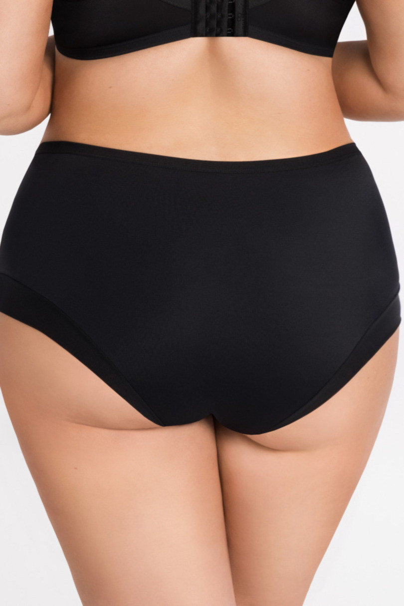 Dámské kalhotky v černé barvě, vyrobené v pohodlném, více postaveném střihu pro stabilní střih a dobré krytí. Střední přední a zadní část je hladká, vyrobená z měkkého materiálu, který pohodlně sedí na těle a zůstává diskrétní pod oblečením. Na bocích jsou lehké panely z elastické síťoviny, zakončené ozdobnou vlnovkou, která celku dodává moderní lehkost a jemně zvýrazňuje boky. V pase je umístěna malá ozdobná destička, která podtrhuje elegantní charakter modelu.