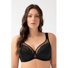 Ten czarny biustonosz to propozycja dla kobiet, które cenią klasyczną elegancję połączoną z subtelną zmysłowością. Gładkie miseczki stanowią solidną bazę podtrzymującą biust, a ich górna część została ozdobiona lekkim, prześwitującym tiulem oraz koronkowymi wstawkami. Taki duet sprawia, że model wygląda wyjątkowo kobieco, ale nadal pozostaje komfortowy i praktyczny na co dzień.