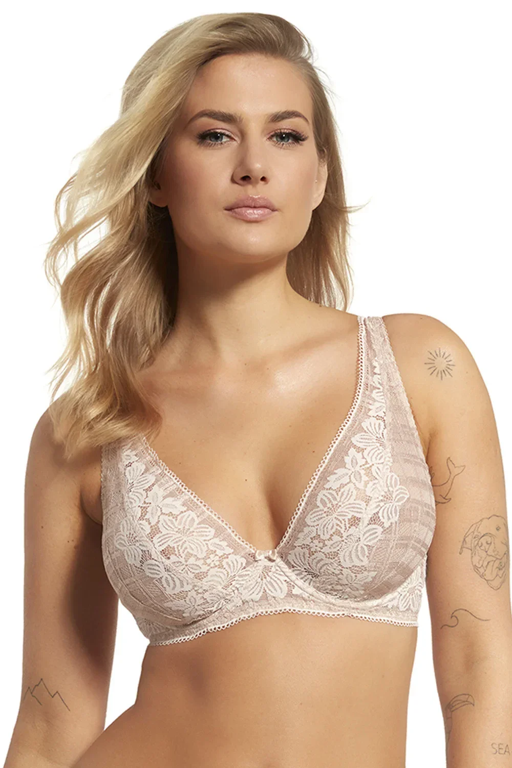 Podprsenka značky Lupo, model 2355, s drátky, které podporují a tvarují prsa. Výrobek má nastavitelná ramínka bez možnosti odepnutí. Kovové háčky na ramínkách. Zapínání na háčky. Místo zapínání: na zádech. 2 řady svislých háčků. 3 úrovně vodorovných háčků. Výrobek je vyroben z 85% polyamidu, 15% elastanu. Typ výstřihu: špičatý. dámský výrobek.