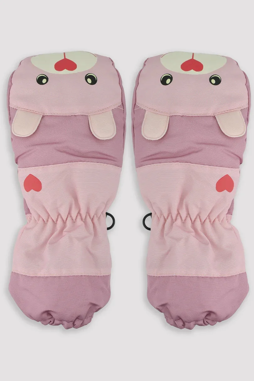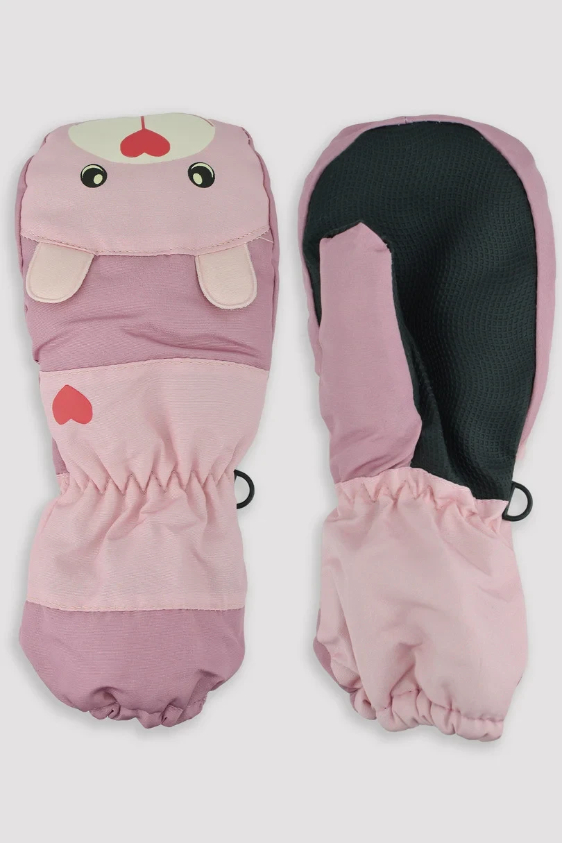 Jednoprsté hřejivé orthalionové rukavice pro dívky s obrázkem medvídka. Rukavice jsou zakončené manžetou - dobře drží na rukou a chrání před sněhem.