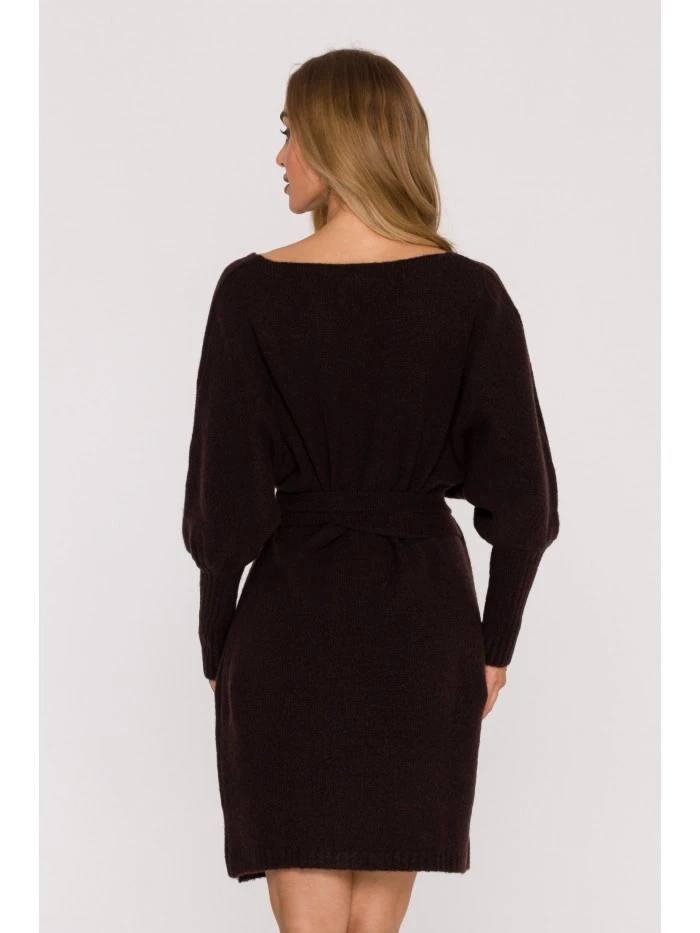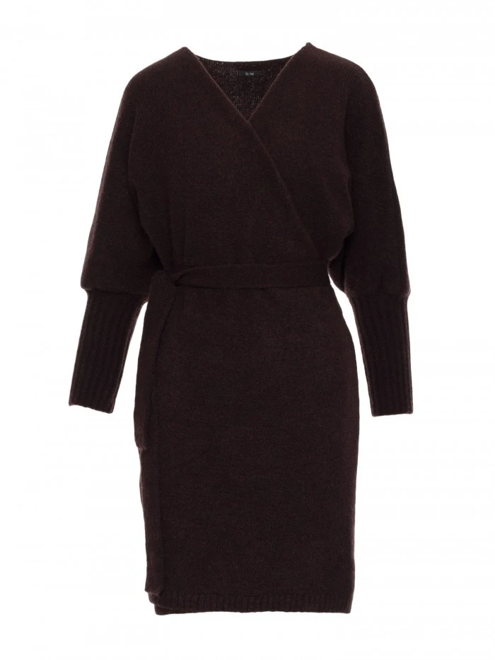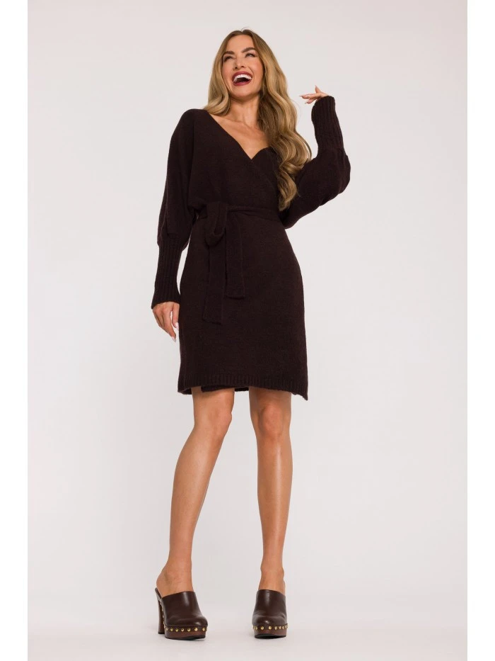 M631 Zavinovací svetrové šaty s vázáním - čokoládové