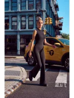 96 % polyester 4 % elastan S těmito rozšířenými kalhotami aktualizujete svůj každodenní nebo společenský styl. Elastická tkanina a vysoký pas lichotí vašemu pasu a nabízí efekt prodloužení nohou. INFORMACE O VÝROBKU: úpletová elastická tkanina kalhoty s vysokým pasem a elastickým pasem rozšířené nohavice naše modelka měří 171 cm a nosí velikost S