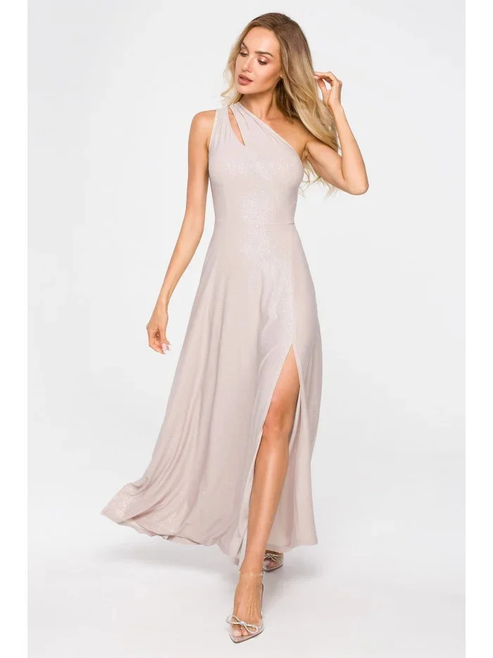 M718 Maxi šaty na jedno rameno - šampaňské