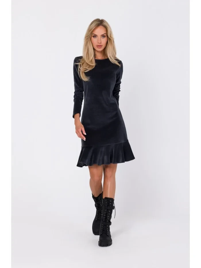 80 % bavlna 20 % polyester INFORMACE O PRODUKTU: pletenina - sametové šaty s volánkovým spodním lemem přetažené přes hlavu dlouhé rukávy nad kolena délka bez podšívky naše modelka je vysoká 171 cm a nosí velikost S Navrženo a vyrobeno v Polsku