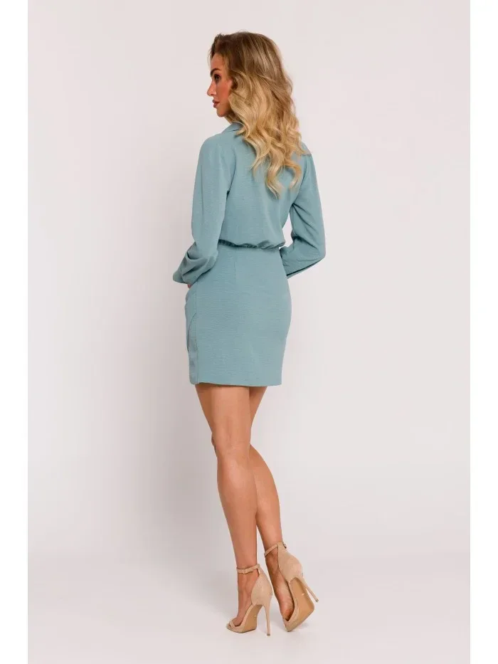 95% polyester 5% elastan INFORMACE O PRODUKTU: tkaná krepová tkanina košilové šaty v délce mini zavinovací top s výstřihem do V a límcem dlouhé rukávy s manžetami na knoflíky zavinovací vypasovaná sukně s řasením na boku skrytý boční zip bez podšívky naše modelka je vysoká 171 cm a nosí velikost S navrženo a vyrobeno v Polsku