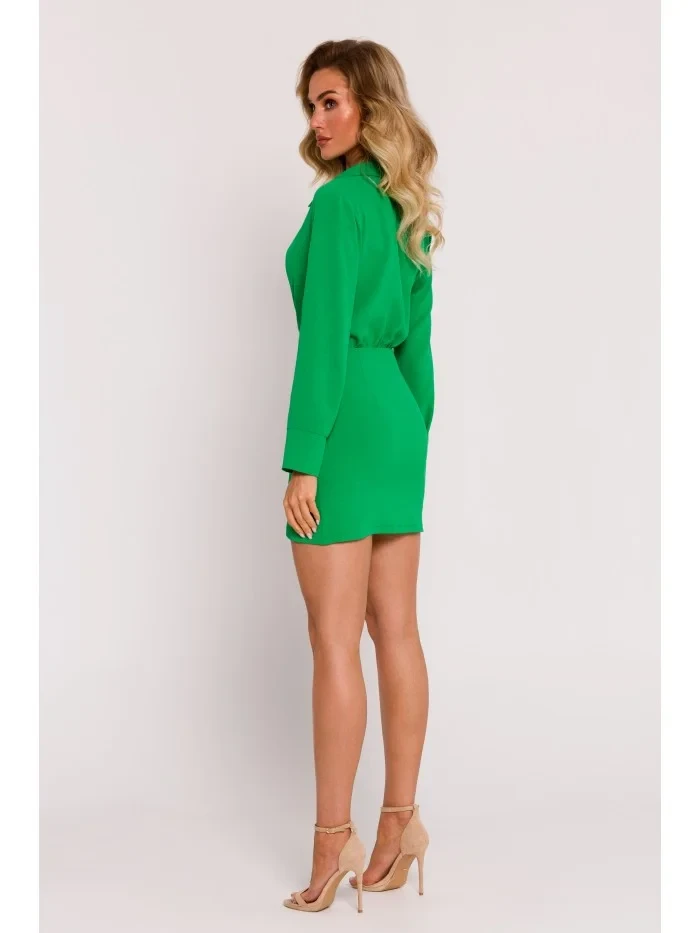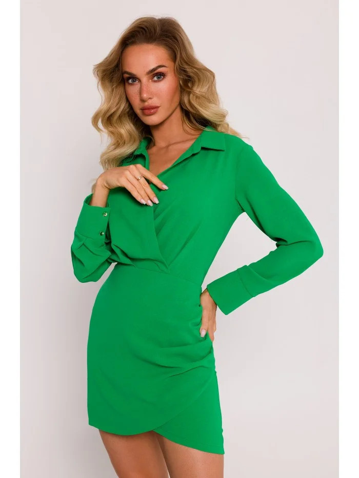 95% polyester 5% elastan INFORMACE O PRODUKTU: tkaná krepová tkanina košilové šaty v délce mini zavinovací top s výstřihem do V a límcem dlouhé rukávy s manžetami na knoflíky zavinovací vypasovaná sukně s řasením na boku skrytý boční zip bez podšívky naše modelka je vysoká 171 cm a nosí velikost S navrženo a vyrobeno v Polsku