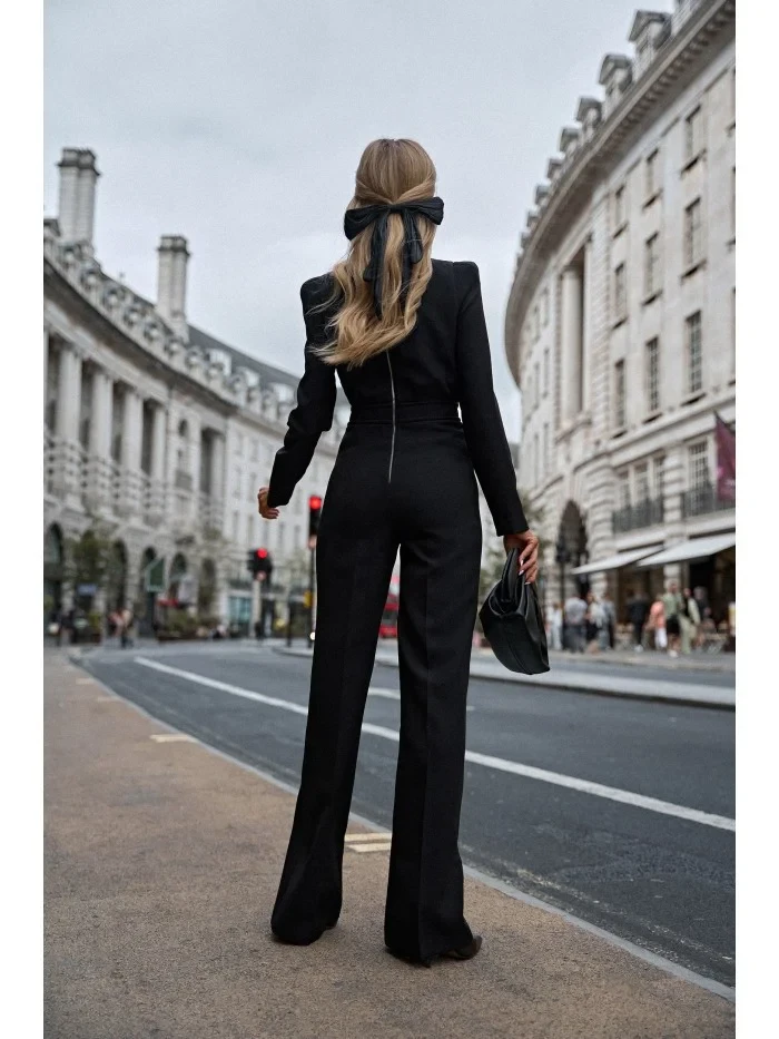 95 % polyester 5 % elastan INFORMACE O PRODUKTU: tkaná látka kombinéza se širokými nohavicemi vypasovaný horní díl a stahování v pase dlouhé rukávy s polstrovanými rameny odhalený zadní zip bez podšívky naše modelka je vysoká 171 cm a nosí velikost S navrženo a vyrobeno v Polsku