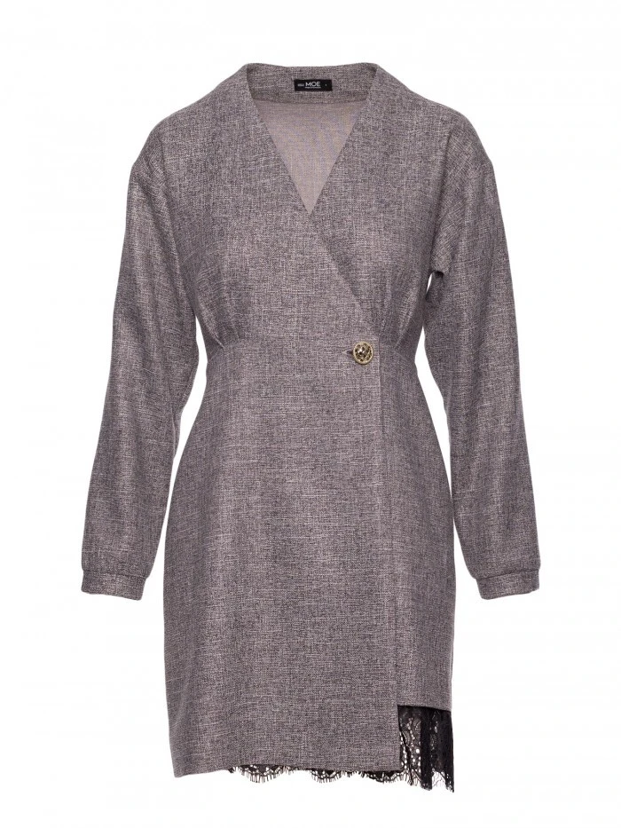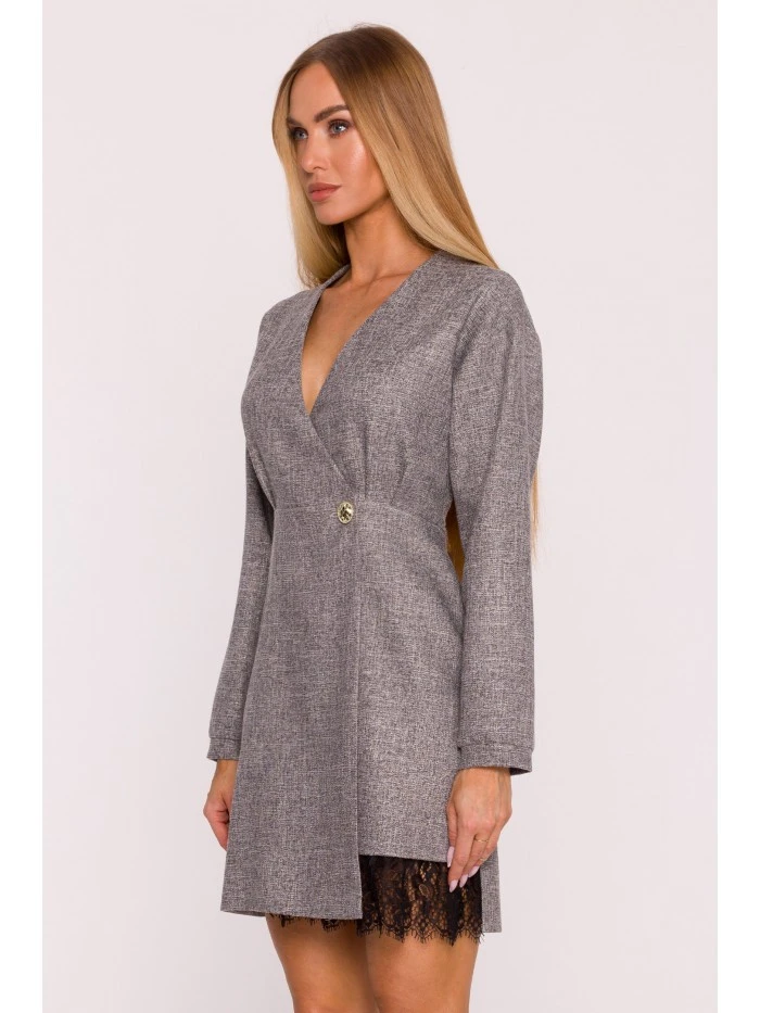 70% polyester 27% wiskoza 3% elastan MATERIÁL Tkanina: Tkanina s krajkovými detaily PODROBNOSTI O PRODUKTU Výstřih: Hluboký výstřih do V Rukávy: Dlouhé Zapínání: Zapíná se na vnitřní skrytý knoflík a vnější ozdobný knoflík Kapsy: Žádné Podšívka: Ne Vzor: Mélange Detaily: Ozdobný zlatý knoflík v pase, krajková vsadka ve spodním lemu Model: M871 Navrženo a vyrobeno v Polsku Modelka na fotografii měří 171 cm a má na sobě velikost S Střih a střih Střih: Lehce přizpůsobený Tvar: Zavinovací přední díl s ohraničeným pasem Délka: Mini