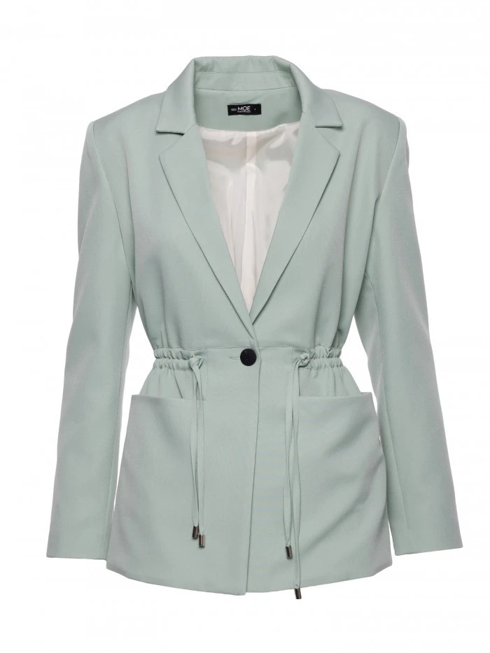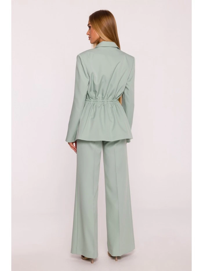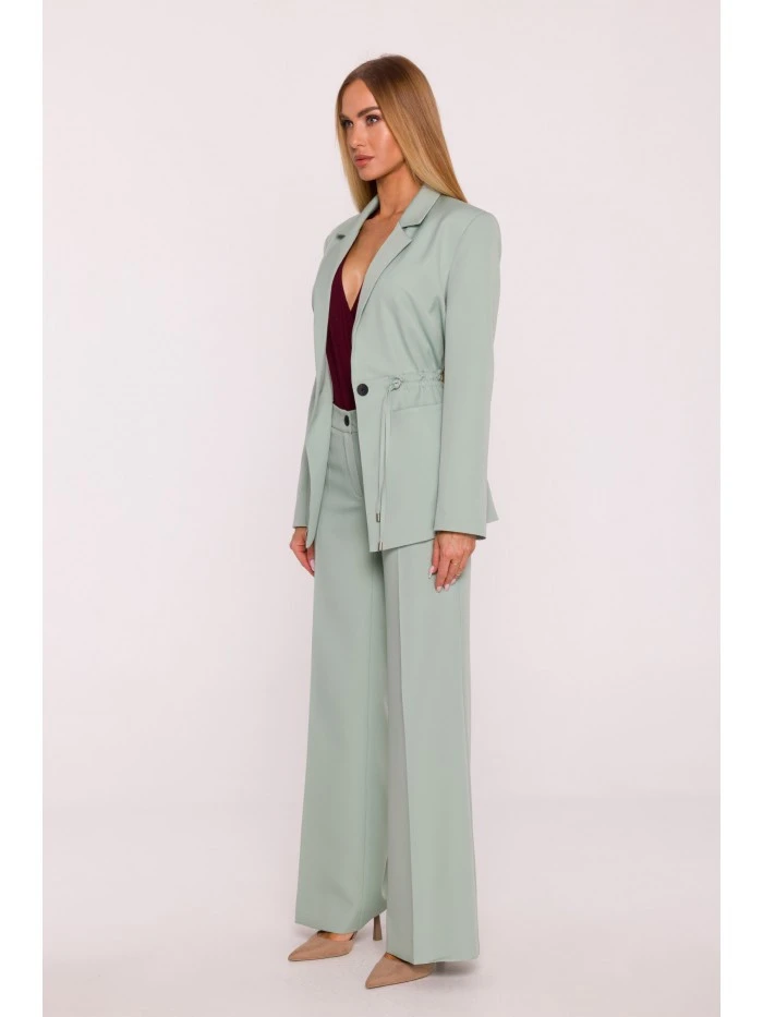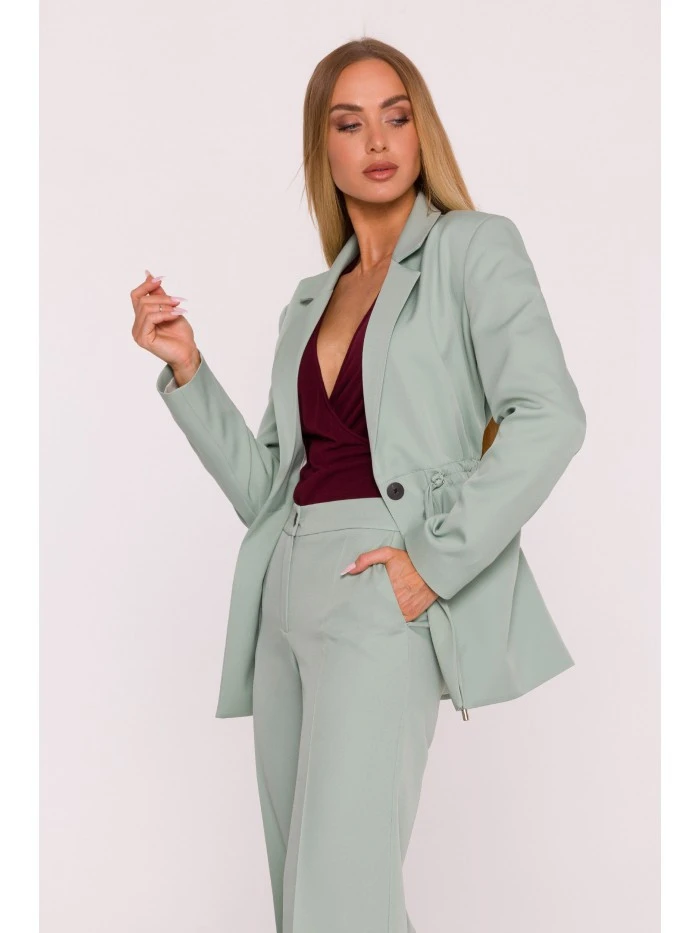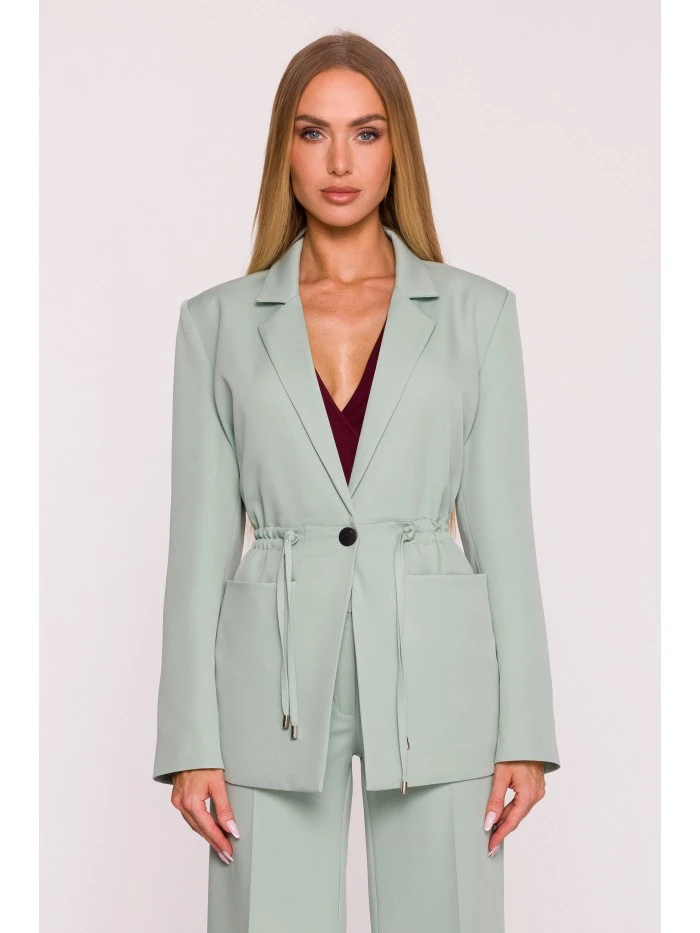 HLAVNÍ LÁTKA: 95% polyester 5% elastan PODŠÍVKA: 100% polyester MATERIÁL Látka: Hladká tkaná látka s matným povrchem PODROBNOSTI O PRODUKTU Límec: Klasický s klopami Zapínání: Na jeden knoflík a nastavitelné stahovací šňůrky Pas: Nastavitelný pomocí stahovacích šňůrek zakončených kovovými koncovkami Kapsy: Velké nakládané kapsy Rukávy: Dlouhé, bez manžet Podšívka: Plně podšité Model: M873 Navrženo a vyrobeno v Polsku Modelka na fotografii měří 171 cm a má na sobě velikost S STŘIH A VÝSTŘIH Střih: Volný, oversized střih s nastavitelným pasem Tvar: Rovný s možností stažení v pase Délka: Po boky