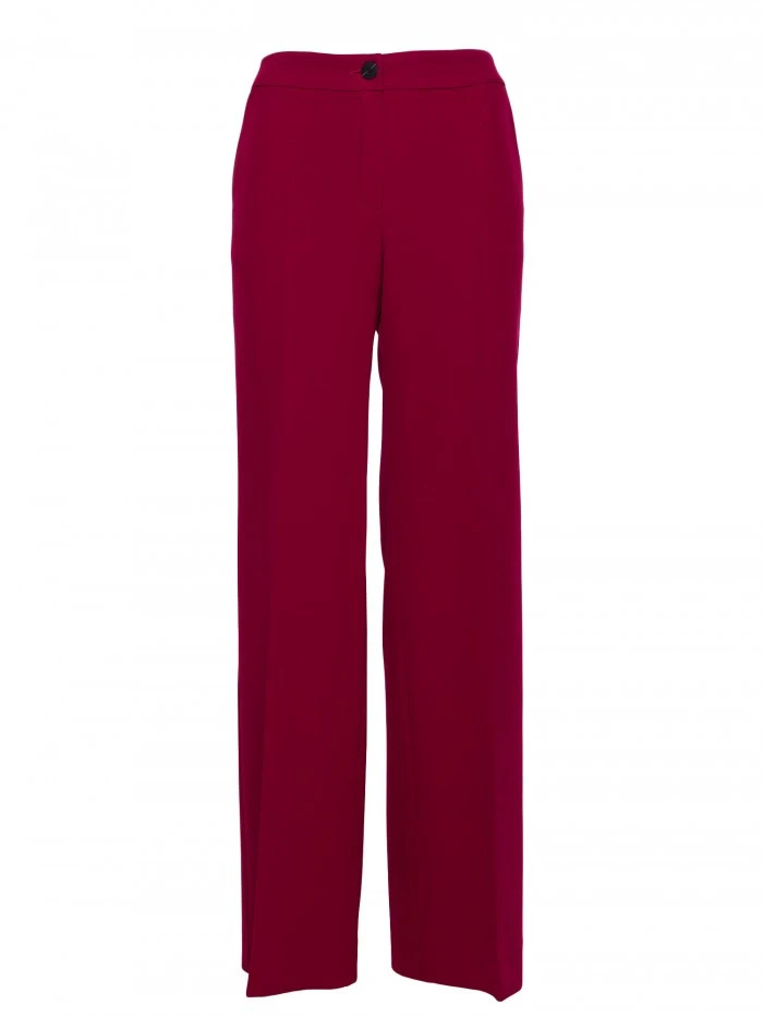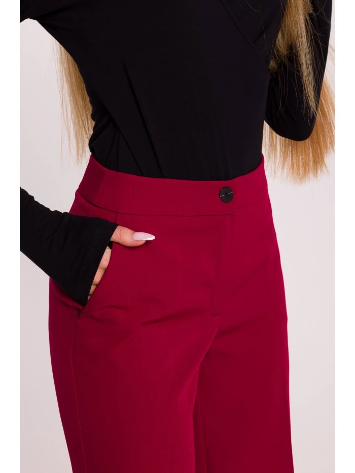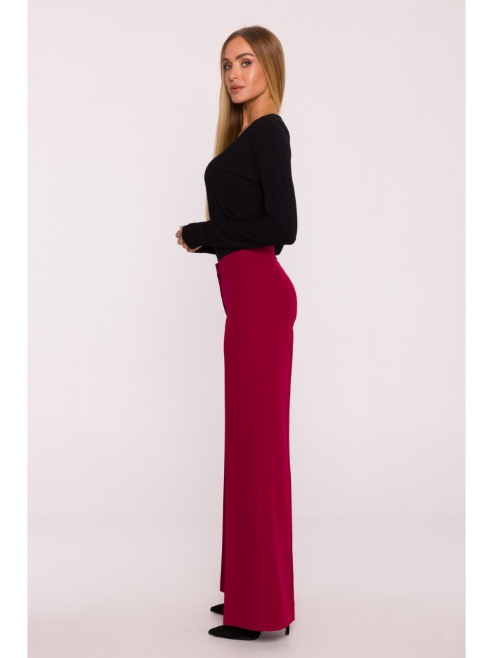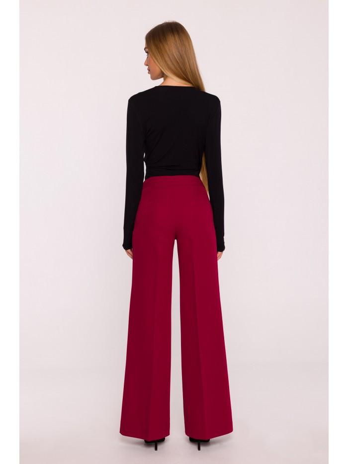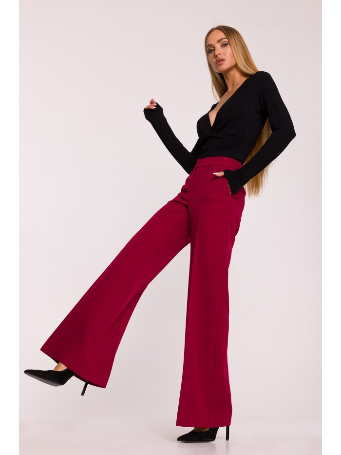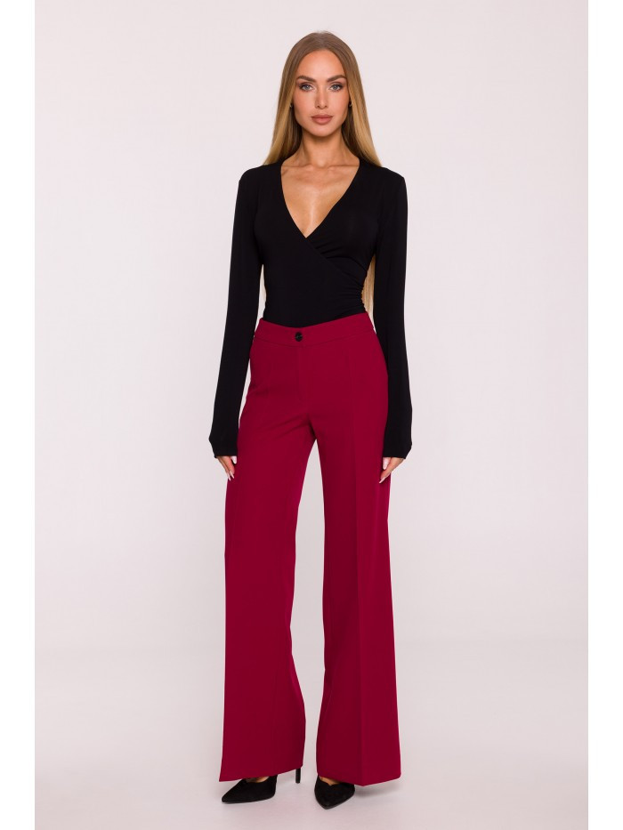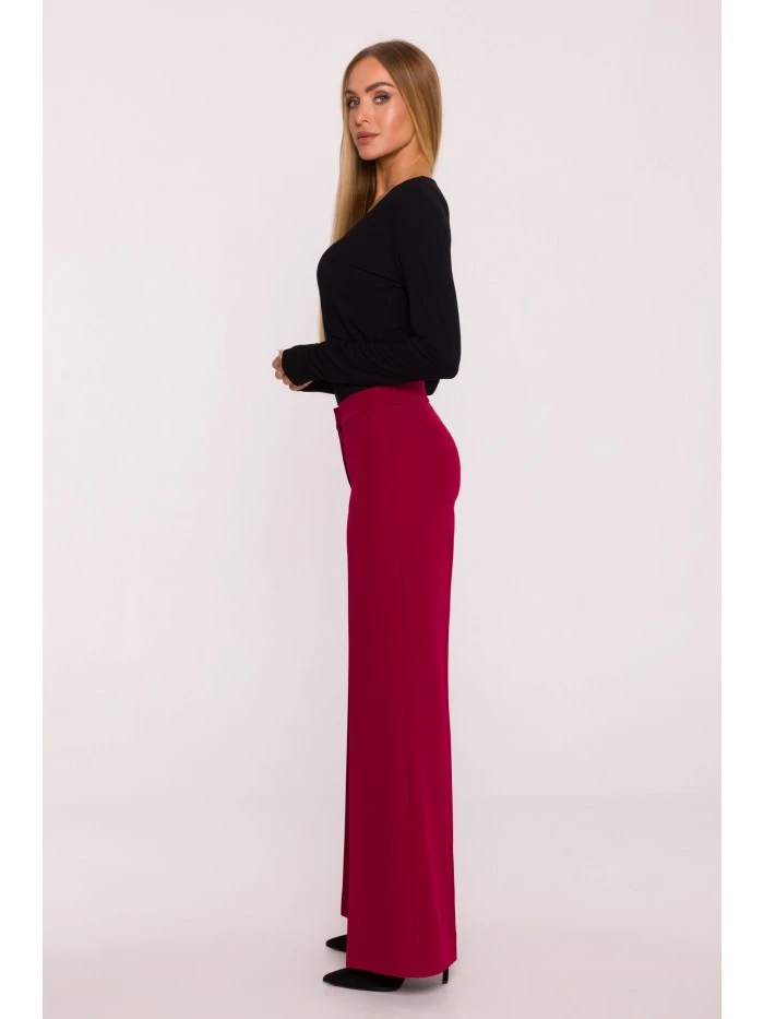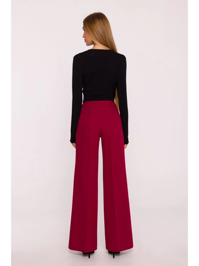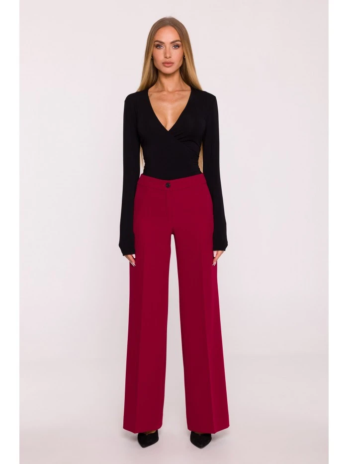 materiál: 95% polyester 5% elastan Tkanina: Hladká tkanina s matnou úpravou PODROBNOSTI O PRODUKTU Pas: Střední pas Zapínání: Knoflík vpředu a skrytý zip Kapsy: Boční kapsy Nohy: Dlouhé, široké nohavice s lisovanými záhyby Podšívka: Bez podšívky Model: M875 Navrženo a vyrobeno v Polsku Modelka na fotografii měří 171 cm a má na sobě velikost S Střih a střih Střih: Klasický střih se širokou siluetou Tvar: Přiléhavý v pase a na bocích, volný od stehen dolů Délka: Po zem