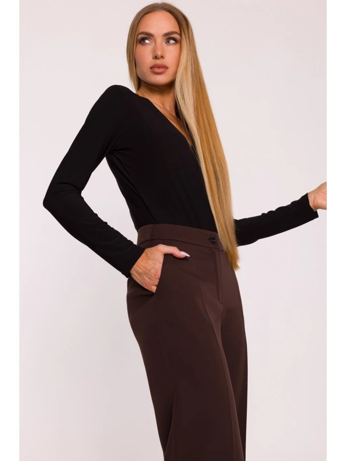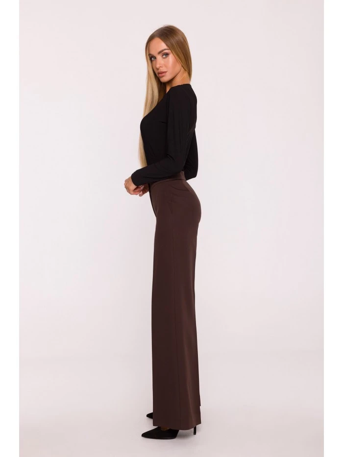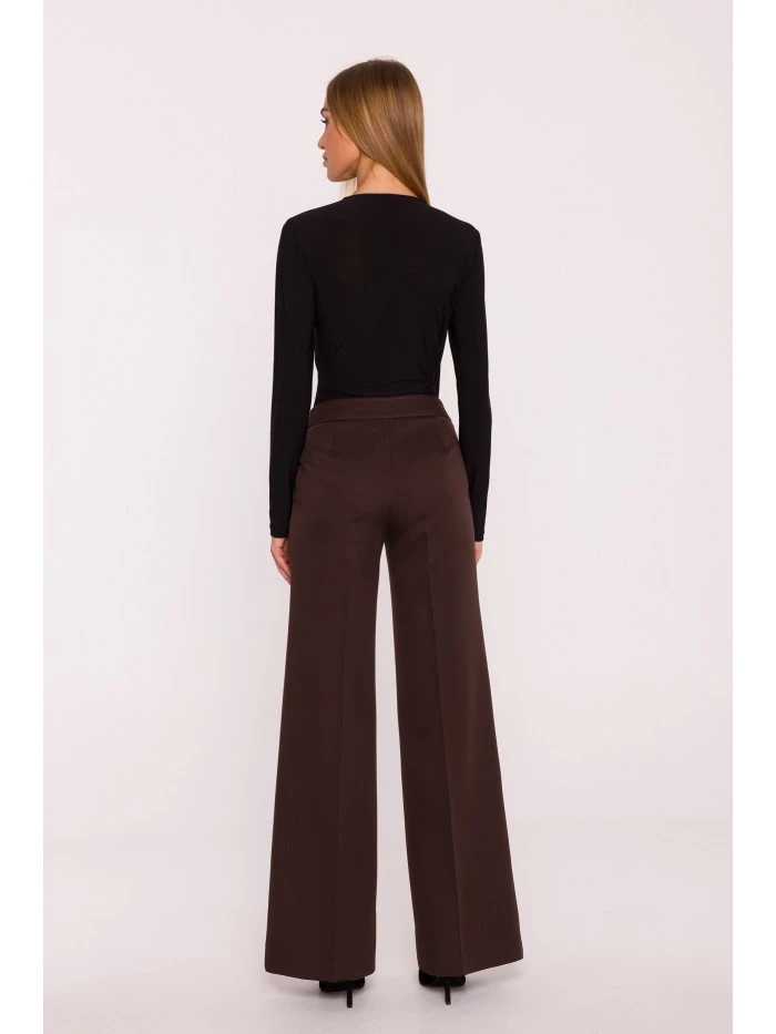 materiál: 95% polyester 5% elastan Tkanina: Hladká tkanina s matnou úpravou PODROBNOSTI O PRODUKTU Pas: Střední pas Zapínání: Knoflík vpředu a skrytý zip Kapsy: Boční kapsy Nohy: Dlouhé, široké nohavice s lisovanými záhyby Podšívka: Bez podšívky Model: M875 Navrženo a vyrobeno v Polsku Modelka na fotografii měří 171 cm a má na sobě velikost S Střih a střih Střih: Klasický střih se širokou siluetou Tvar: Přiléhavý v pase a na bocích, volný od stehen dolů Délka: Po zem