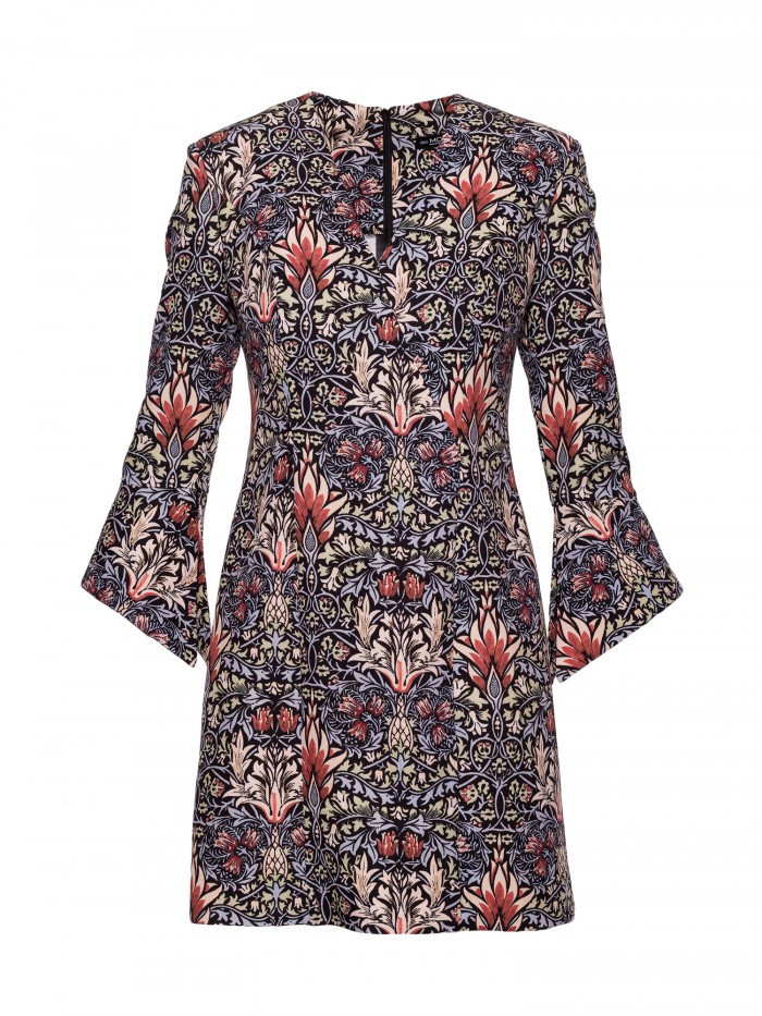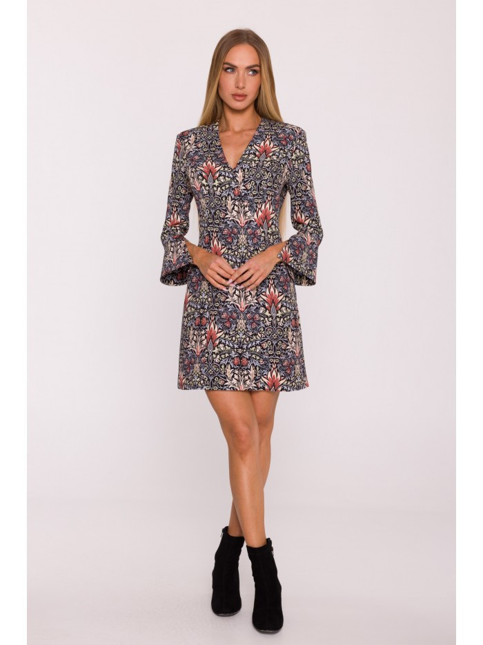 materiál: 95% polyester 5% elastan Tkanina: vícebarevný botanický potisk; matný povrch PODROBNOSTI O PRODUKTU Výstřih: do V Rukávy: 7/8 délky, mírně rozšířené na manžetách Zapínání: skrytý zip na zádech Kapsy: žádné Podšívka: žádná Vzor: dekorativní, květinový, inspirovaný retro stylem Model: M877 Navrženo a vyrobeno v Polsku Modelka na fotografii měří 171 cm a má na sobě velikost S STYL A STŘIH Styl: rovný, mírně vypasovaný Tvar: mírně vypasovaný na ramenou, volný směrem k lemu Délka: mini