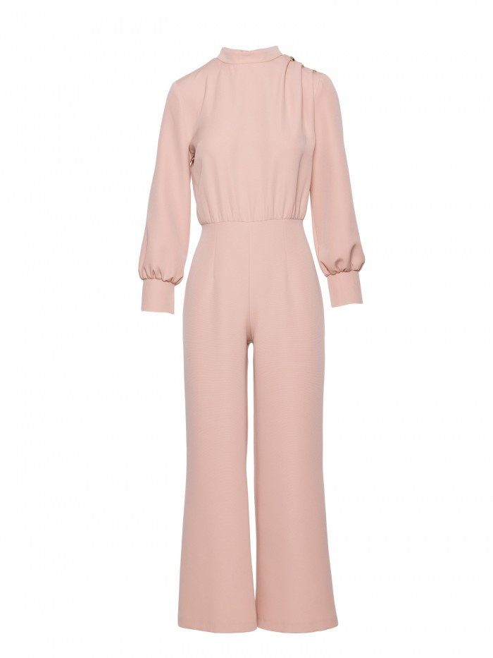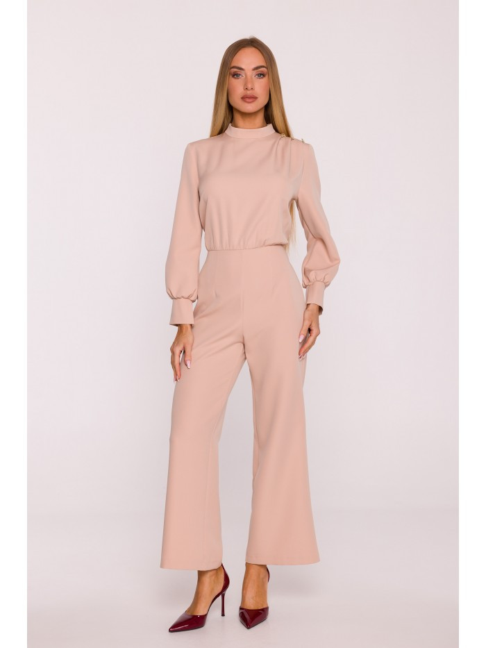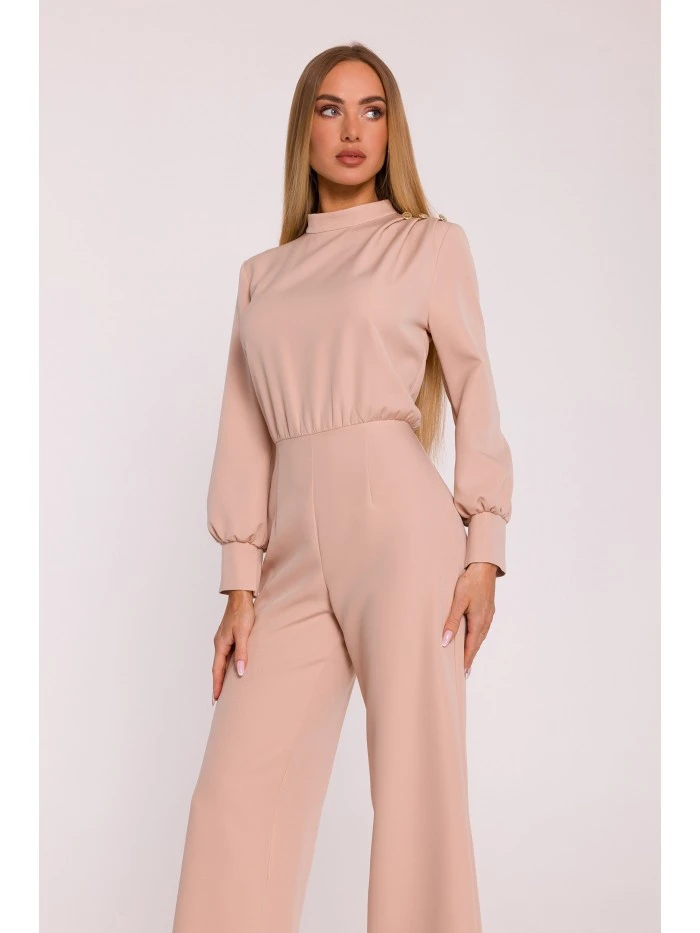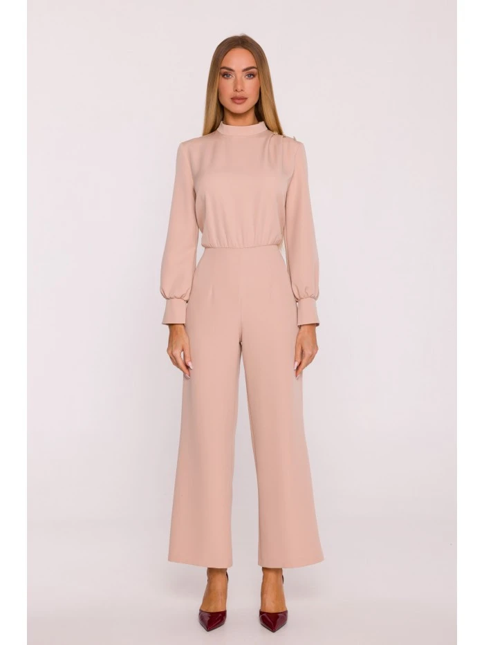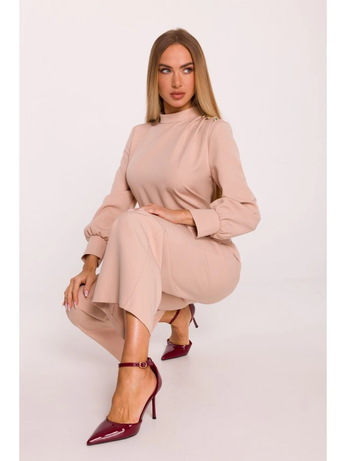 materiál: 95% polyester 5% elastan Tkanina: hladká tkanina s matným povrchem PODROBNOSTI O PRODUKTU Výstřih: stojáček s jemným řasením na ramenou Rukávy: dlouhé, zakončené širokými manžetami s rozparkem Zapínání: skrytý zip na zádech Kapsy: žádné Nohy: široké, 7/8 délka Podšívka: žádná Detaily: ozdobné knoflíky na rameni Vzor: hladký Model: M879 Navrženo a vyrobeno v Polsku Modelka na fotografii měří 171 cm a má na sobě velikost S STYL A STŘIH Styl: elegantní, ženský Tvar: mírně vypasovaný top s řasením, vypasovaný pas, široké nohavice Délka: jednodílný overal, 7/8 délka nohavic