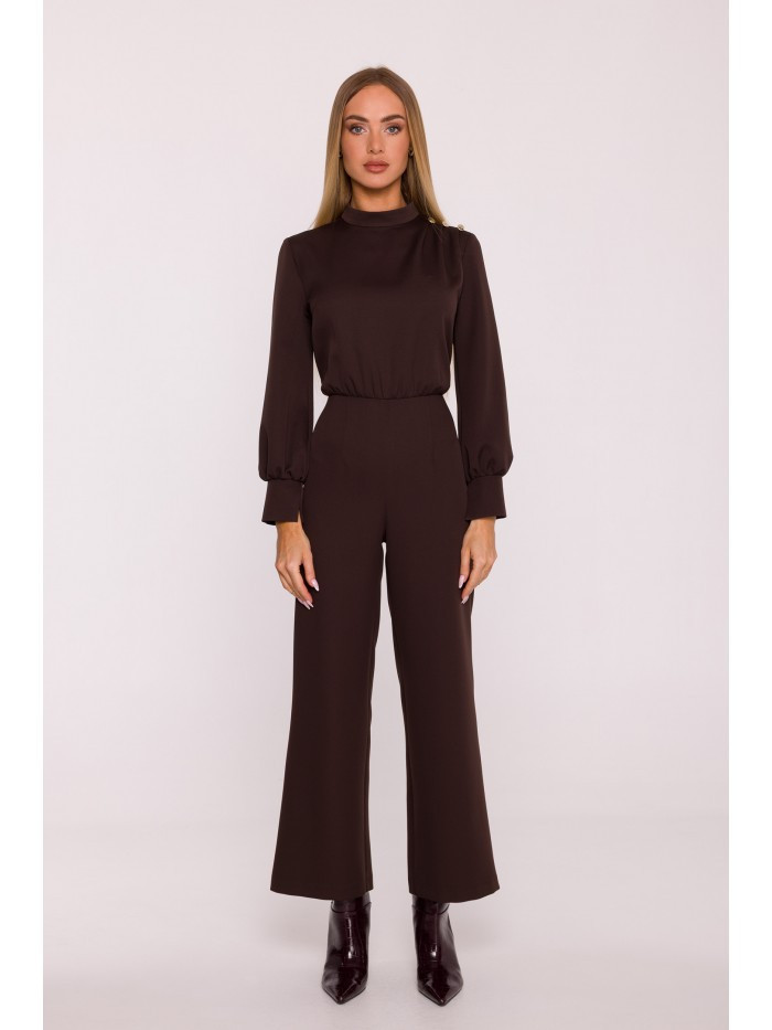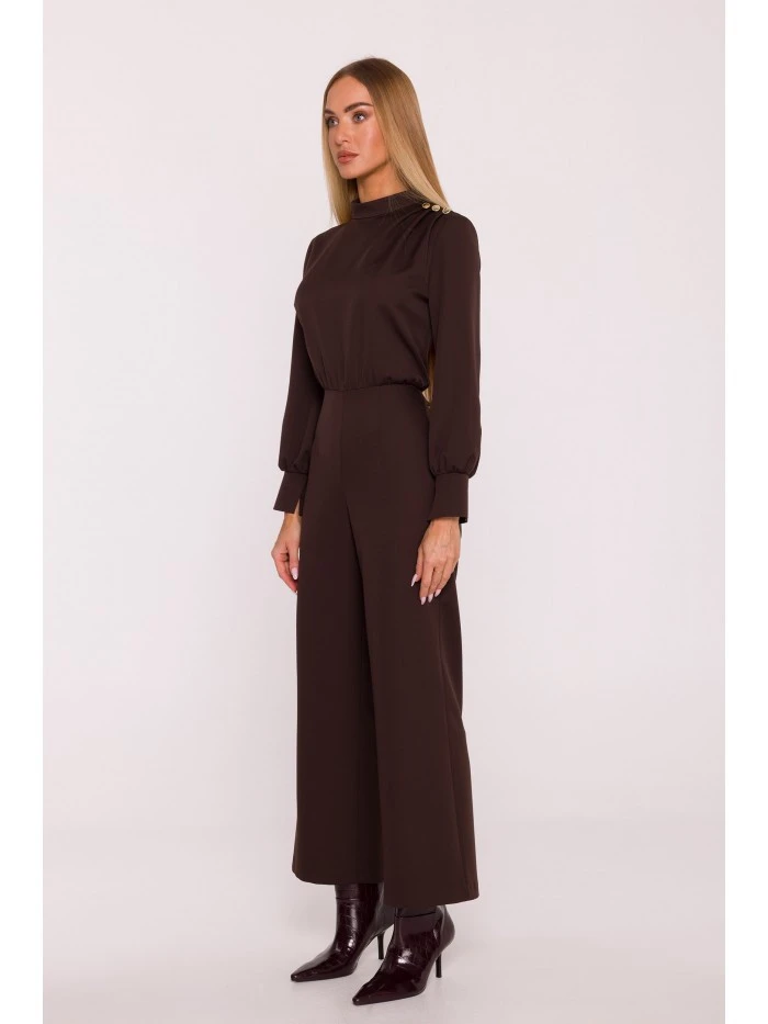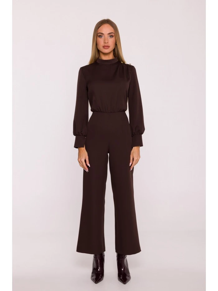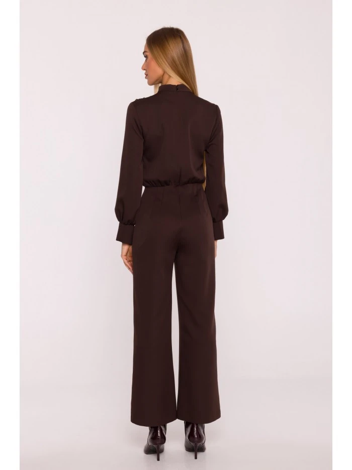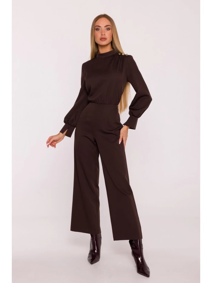 materiál: 95% polyester 5% elastan Tkanina: hladká tkanina s matným povrchem PODROBNOSTI O PRODUKTU Výstřih: stojáček s jemným řasením na ramenou Rukávy: dlouhé, zakončené širokými manžetami s rozparkem Zapínání: skrytý zip na zádech Kapsy: žádné Nohy: široké, 7/8 délka Podšívka: žádná Detaily: ozdobné knoflíky na rameni Vzor: hladký Model: M879 Navrženo a vyrobeno v Polsku Modelka na fotografii měří 171 cm a má na sobě velikost S STYL A STŘIH Styl: elegantní, ženský Tvar: mírně vypasovaný top s řasením, vypasovaný pas, široké nohavice Délka: jednodílný overal, 7/8 délka nohavic