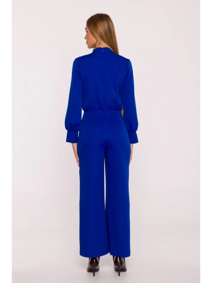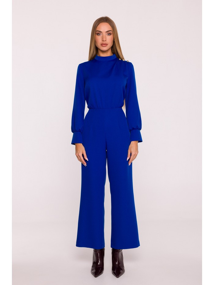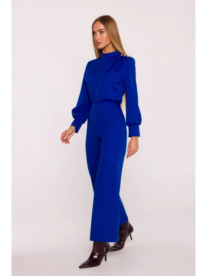 materiál: 95% polyester 5% elastan Tkanina: hladká tkanina s matným povrchem PODROBNOSTI O PRODUKTU Výstřih: stojáček s jemným řasením na ramenou Rukávy: dlouhé, zakončené širokými manžetami s rozparkem Zapínání: skrytý zip na zádech Kapsy: žádné Nohy: široké, 7/8 délka Podšívka: žádná Detaily: ozdobné knoflíky na rameni Vzor: hladký Model: M879 Navrženo a vyrobeno v Polsku Modelka na fotografii měří 171 cm a má na sobě velikost S STYL A STŘIH Styl: elegantní, ženský Tvar: mírně vypasovaný top s řasením, vypasovaný pas, široké nohavice Délka: jednodílný overal, 7/8 délka nohavic