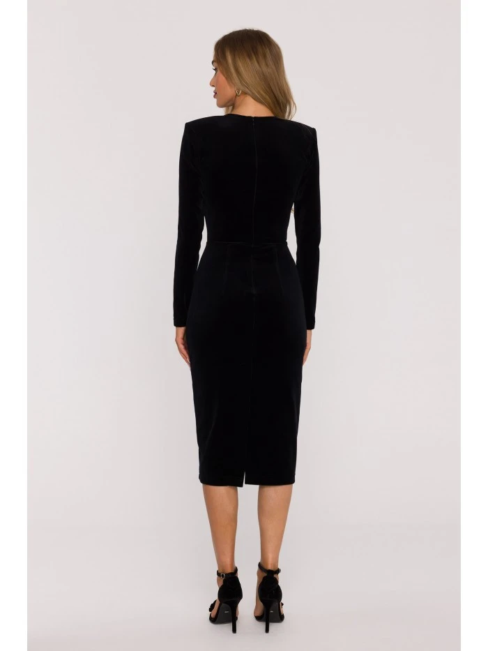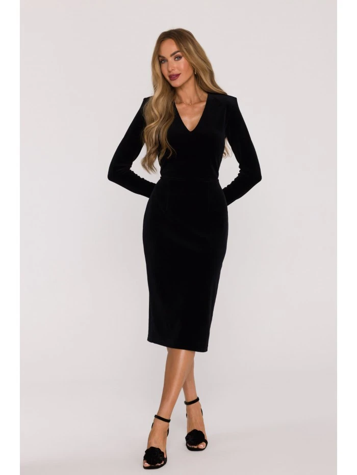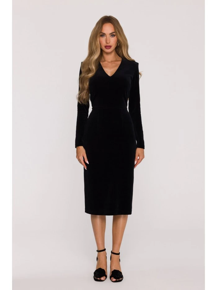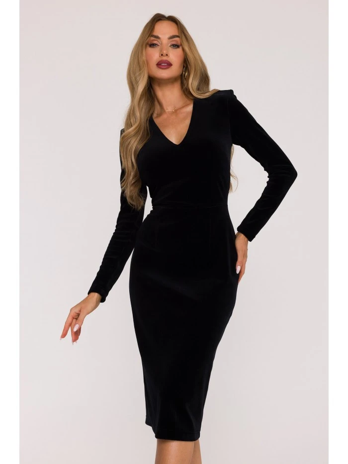 80% bavlna 20% polyester MATERIÁL Tkanina: úplet - měkký, elegantní samet PODROBNOSTI O PRODUKTU Výstřih: hluboký výstřih do V Rukávy: dlouhé, rovné Zapínání: skrytý zip na zádech Kapsy: žádné Podšívka: žádná Model: M889 Navrženo a vyrobeno v Polsku Modelka na fotografii měří 171 cm a má na sobě velikost S STYL A STŘIH Styl: klasické tužkové midi šaty Tvar: vypasovaný horní i dolní díl se zvýrazněným pasem Délka: pod kolena