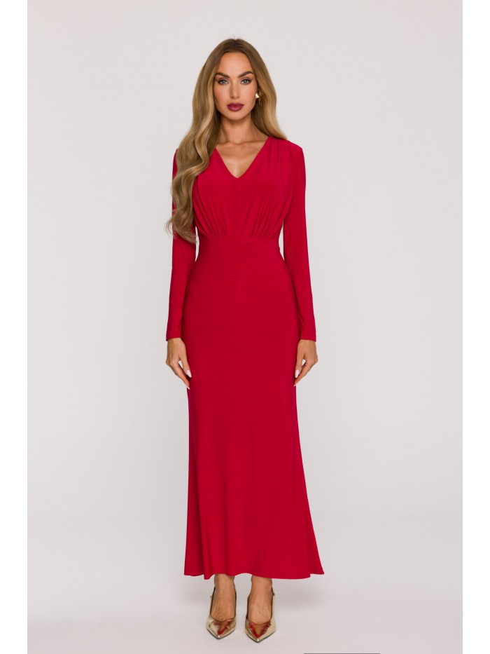 materiál: 95% polyester 5% elastan Materiál: hladký úplet - měkký, pružný a příjemný na nošení PODROBNOSTI O PRODUKTU Výstřih: do V Rukávy: dlouhé, vypasované Pas: zvýrazněný jemným řasením Sukně: dlouhá, směrem ke spodnímu okraji mírně rozšířená Zapínání: skrytý boční zip Doplňky: samostatná šerpa, kterou lze uvázat kolem krku nebo různě upravit Kapsy: žádné Podšívka: žádná Model: M891 Navrženo a vyrobeno v Polsku Modelka na fotografii měří 171 cm a má na sobě velikost S STYL A STŘIH Styl: dlouhé, vypasované maxi šaty s výstřihem do V a samostatnou šerpou Tvar: vypasovaný horní díl, vymezený pas, mírně rozšířená sukně Délka: maxi - délka až na zem