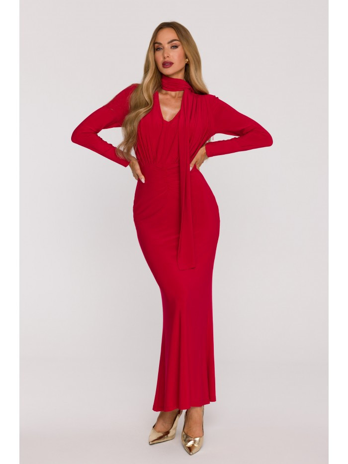 M891 Šaty s řasením a šerpou - červené