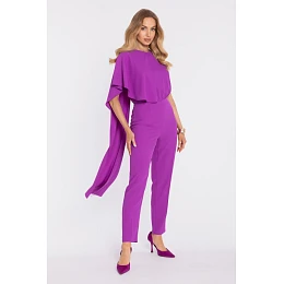 95% polyester 5% elastane MATERIAL Fabric: smooth fabric with a subtle sheen. PRODUCT DETAILS Neckline: round, subtly modest – highlights the neck. Top: statement asymmetric cape overlay draping over one shoulder (adds movement and a “wow” effect). Sleeve: asymmetric – sleeveless on one side, while the other side features a cape-style overlay forming a relaxed short sleeve, extended into a long draped panel at the back. Waist: defined – fitted at the waist for a flattering shape. Legs: straight, slightly tapered, ankle length. Closure: concealed back zipper from the waist down; single button at the neckline (hidden under the cape overlay). Pockets: none. Lining: lined top. Model: M907. Designed and made in Poland. The model in the photo is 171 cm tall and is wearing size S. FIT AND CUT Style: elegant jumpsuit with a cape top and slim ankle-length legs. Shape: relaxed, figure-softening upper part; defined waist; elongating leg line. Length: 7/8 (ankle length).