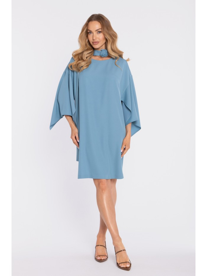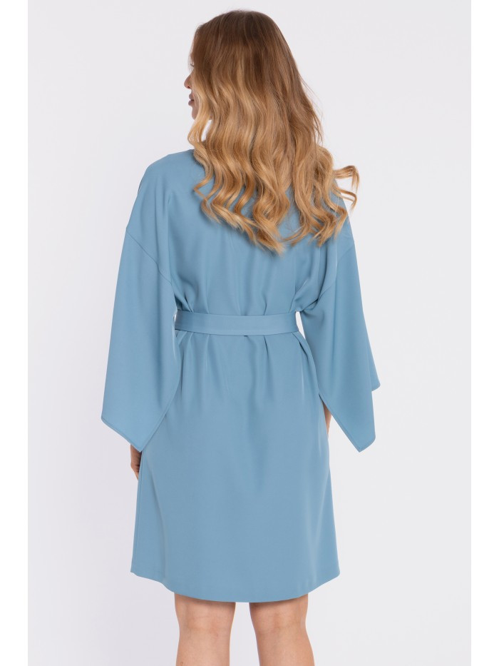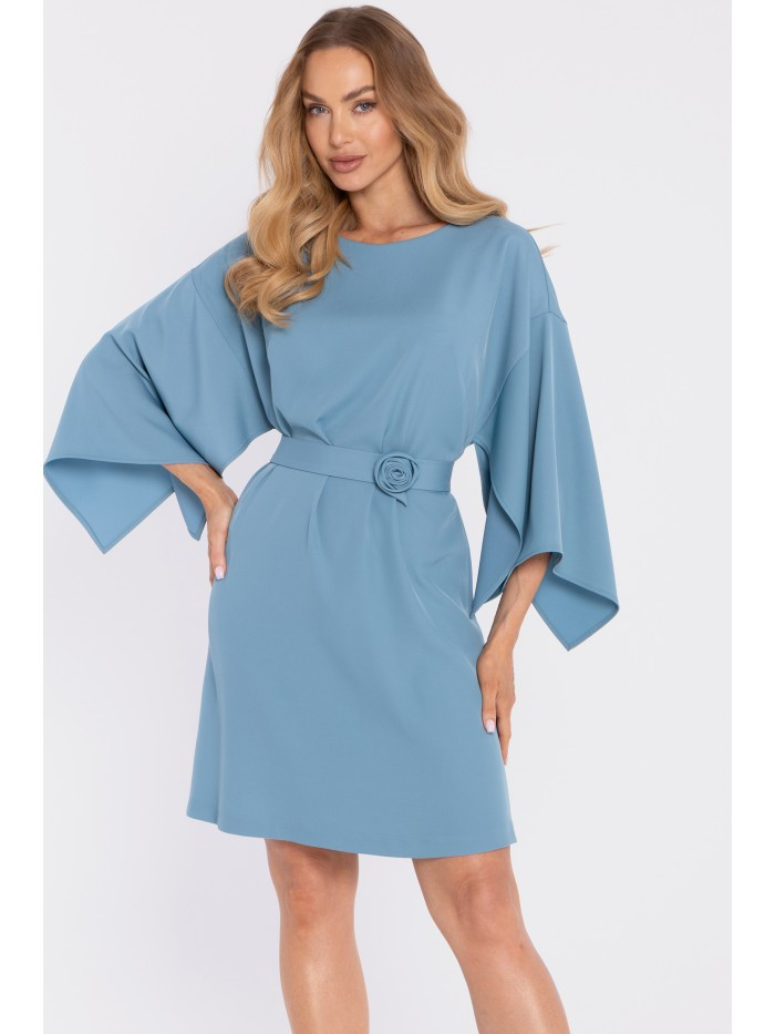 95% polyester 5% elastane MATERIAL Fabric: smooth fabric with a subtle sheen. PRODUCT DETAILS Neckline: boat / modest round-boat shape – subtly highlights the neckline. Sleeves: wide, relaxed kimono/cape-style sleeves – fluid and statement-making. Waist: defined with a belt (separate piece, included with the dress) Skirt: straight, easy fit with a subtle A-line feel. Closure: none, slip-on style (pulled on over the head). Pockets: none. Lining: none. Model: M908. Designed and made in Poland. The model in the photo is 171 cm tall and is wearing size S. FIT AND CUT Style: minimalist dress with wide sleeves and a matching belt. Shape: relaxed kimono top, waist shaped with the belt, clean straight skirt. Length: above the knee.