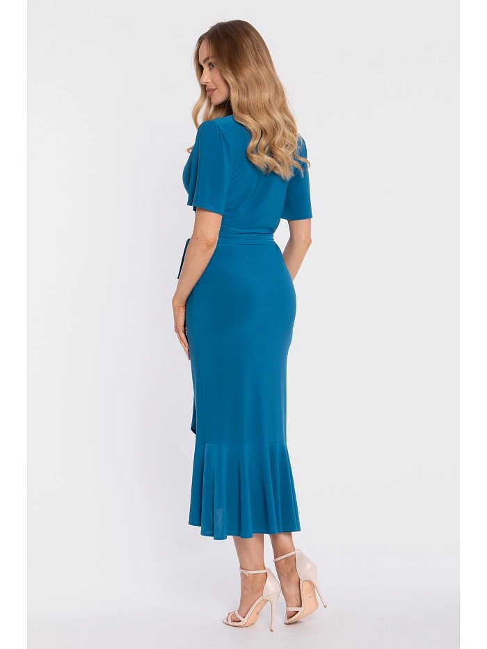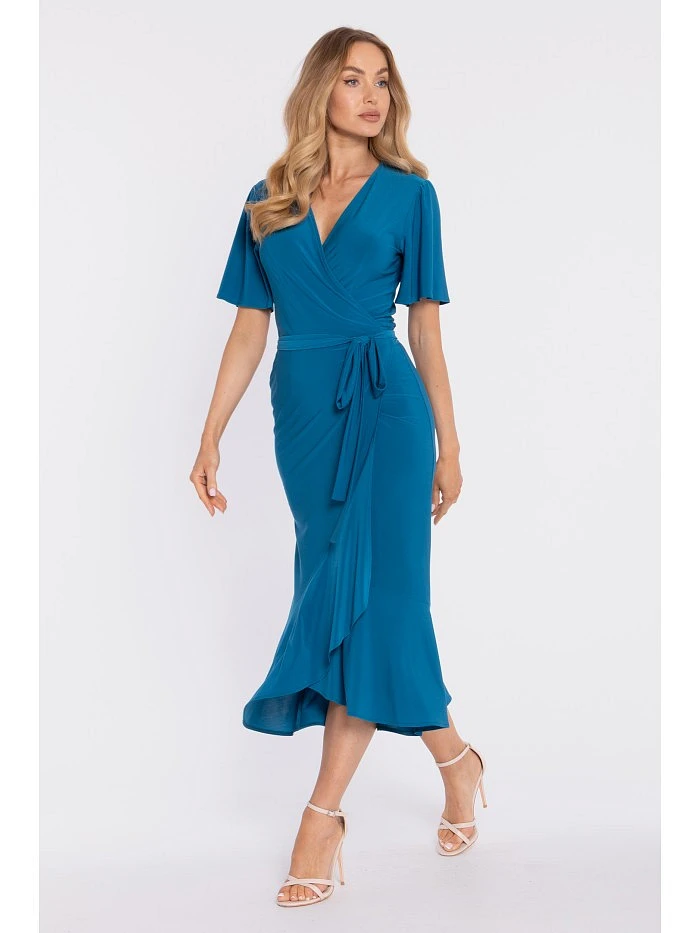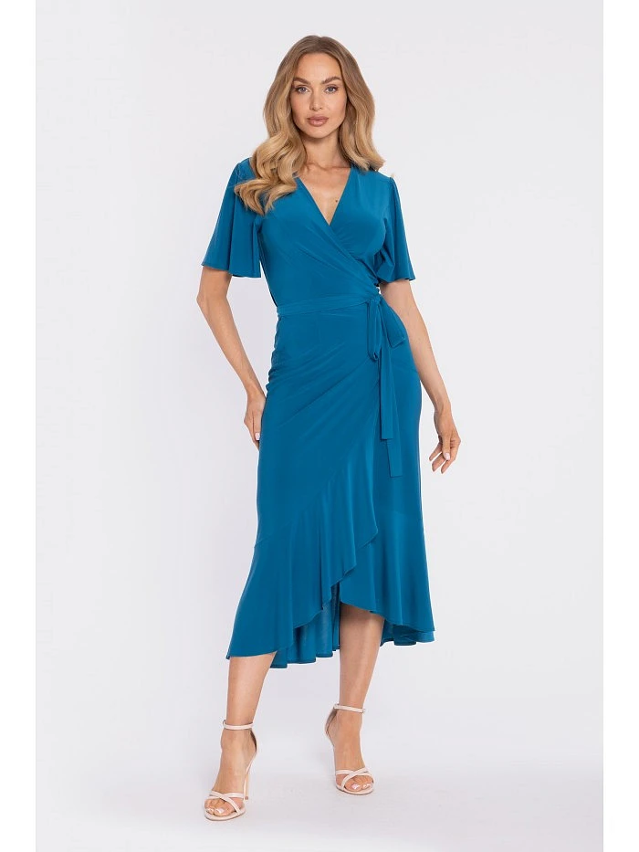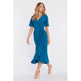 M912 Zavinovací midi šaty s volánem a řasením - oceánsky modré