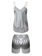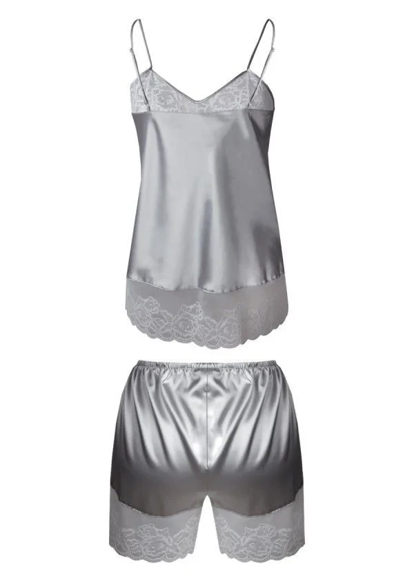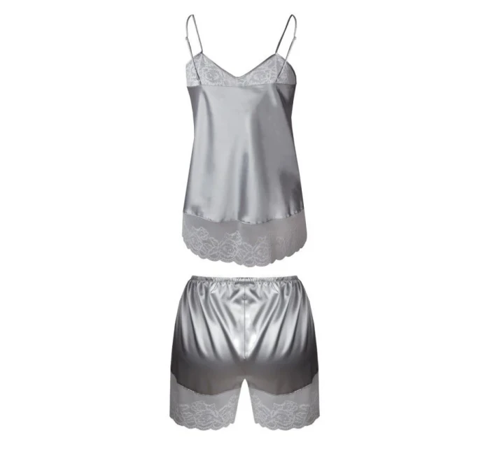 Připravte se na něco výjimečného... Stříbrný, elegantní, hladký satén - výjimečně jemný a příjemný na dotek v kombinaci s bílou, smyslnou krajkou - Madison - novinka od DKaren je komplet, který chceme nechat vyniknout. Chcete se uvolnit jako bohyně - směle sáhněte po takovém rafinovaném prádle. Halenka má krajkové rukávy a malý výstřih, zatímco šortky svádějí krajkou lemovanými stehny. materiál: 100% polyester.