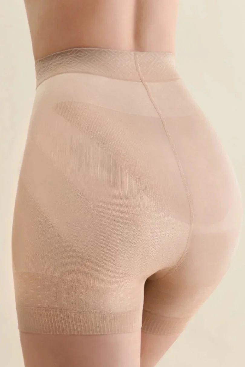 Majtki modelujące push-up posiadają specjaln Prodloužené nohavice zabraňují odírání stehen. Mírně lesklý úplet a ozdobný vzorór odkazují na estetiku elegantního krajkového prádla.