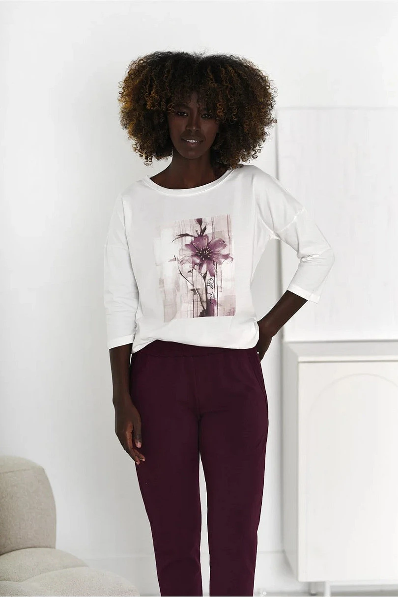 Tato dámská halenka s 3/4 rukávy v sobě spojuje pohodlí, styl a jemnou eleganci. Je vyrobena z vysoce kvalitní bavlny s přídavkem elastanu, což zaručuje dokonalé padnutí a celodenní pohodlí. Na přední straně je výrazný potisk se zlatými akcenty, které dodávají halence jemný třpyt a ženský nádech. Rovný střih zakončený klasickým lemem umožňuje ležérní styling - lze ji nosit buď zastrčenou do kalhot, nebo volně nahoře. Skvěle se hodí na každodenní nošení, do práce nebo na setkání s přáteli.