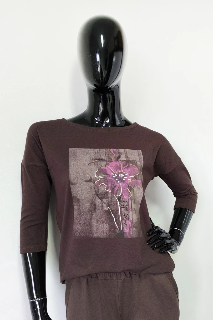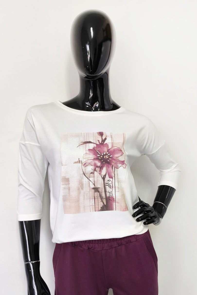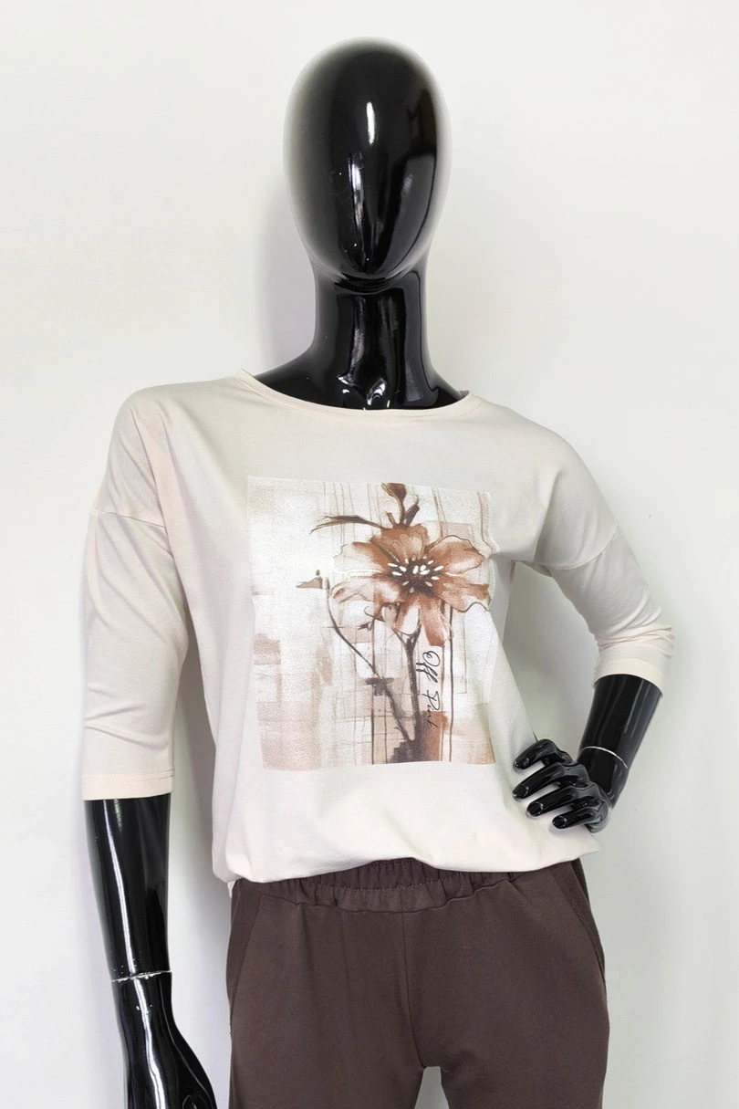 Halenka s tříčtvrtečním rukávem je kombinací pohodlí, stylu a jemné elegance. Je vyrobena z vysoce kvalitní bavlny s přídavkem elastanu, takže perfektně padne a poskytuje celodenní pohodlí. Na předním díle je poutavý potisk se zlatými akcenty, které halence dodávají jemný lesk a ženský nádech. Rovný spodní lem zakončený klasickou linkou umožňuje ležérní styling – lze ji nosit buď zastrčenou do kalhot, nebo volně nahoře. Skvěle se hodí na každodenní nošení, do práce nebo na setkání s přáteli.