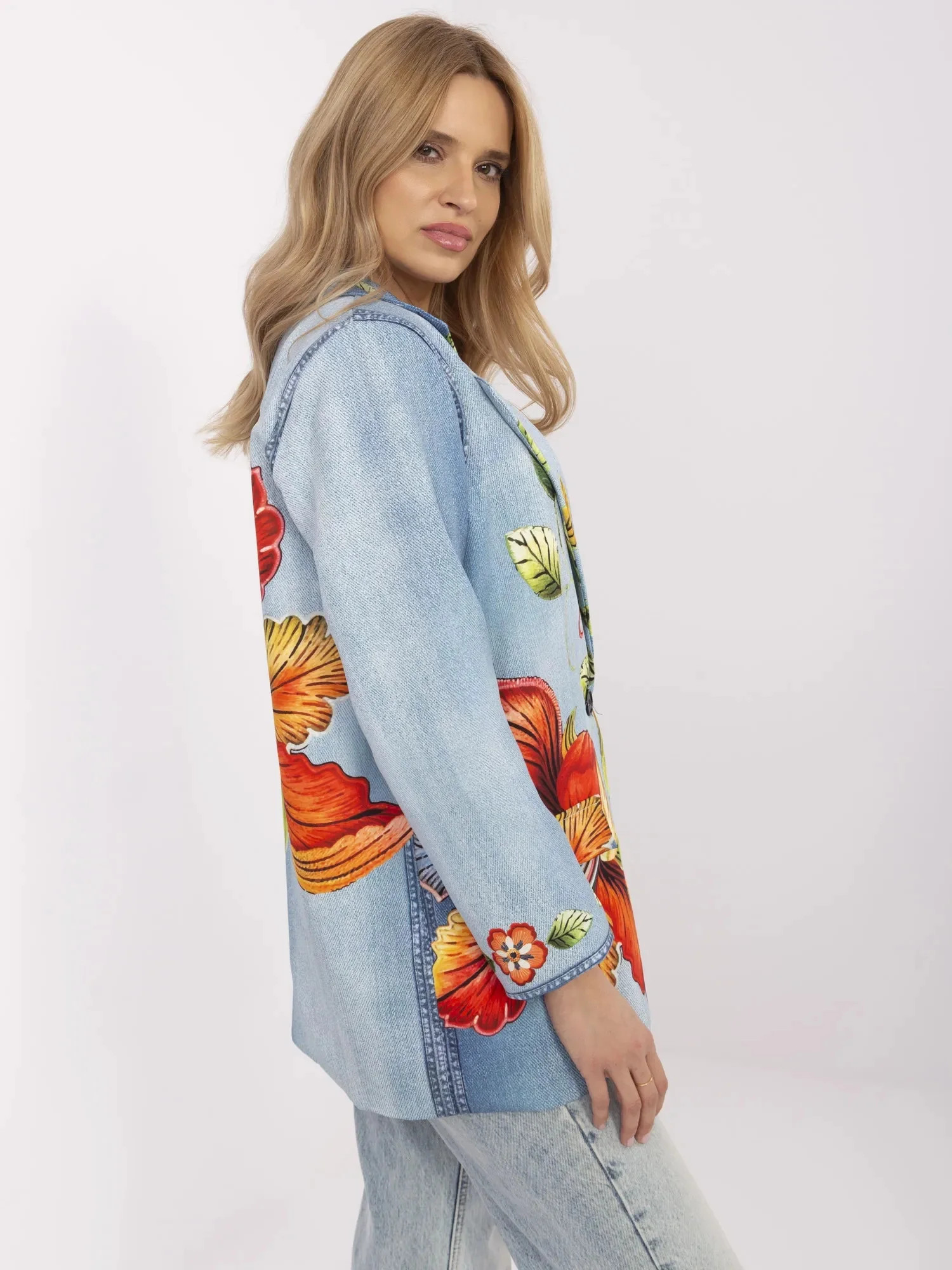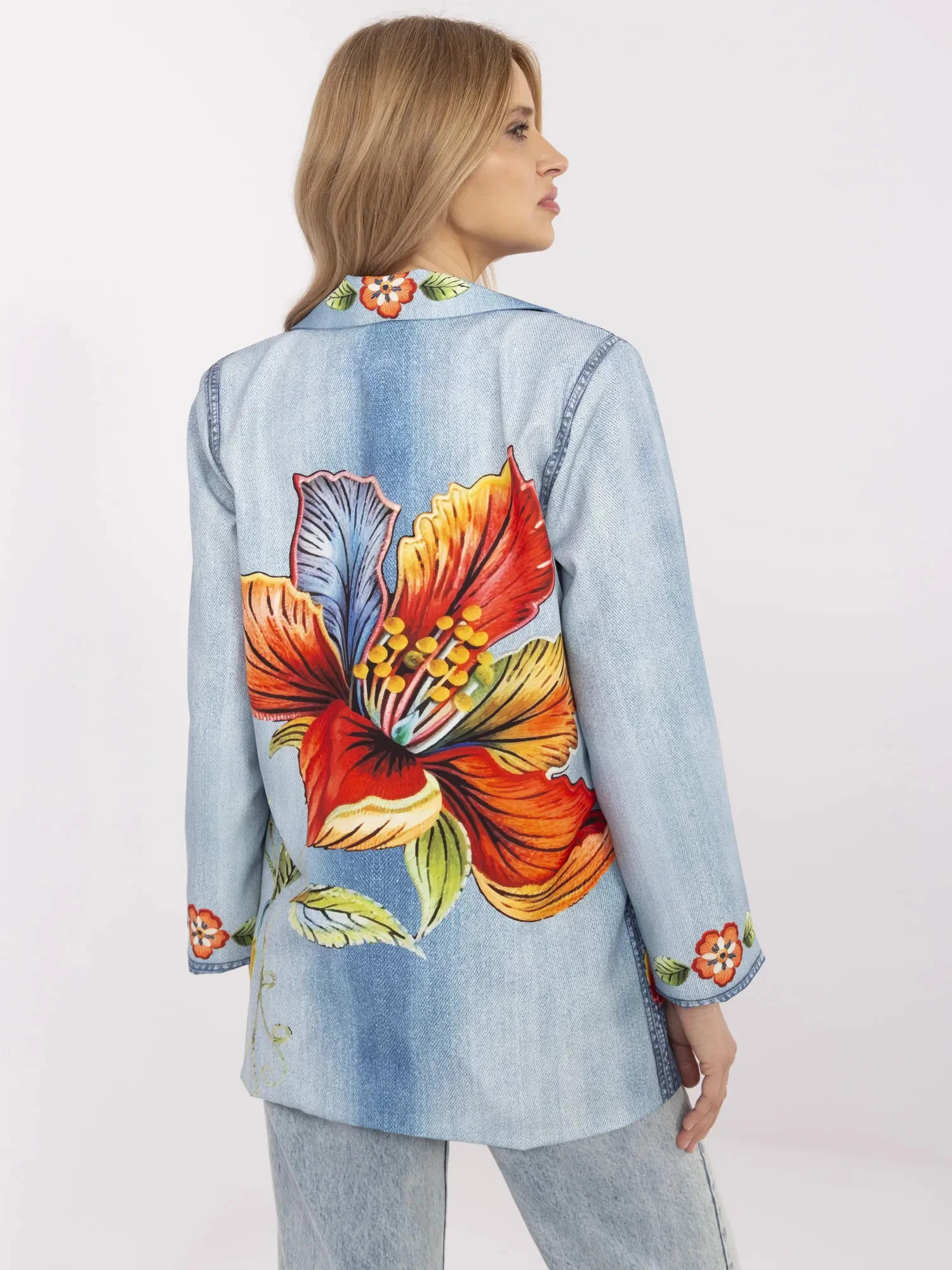 Wymiary marynarki w rozmiarze one size mierzone na płasko: szerokość pod pachami - 54 cm, długość rękawa - 57 cm (od szwu), długość całkowita - 75 cm, szerokość w biodrach - 48 cm.