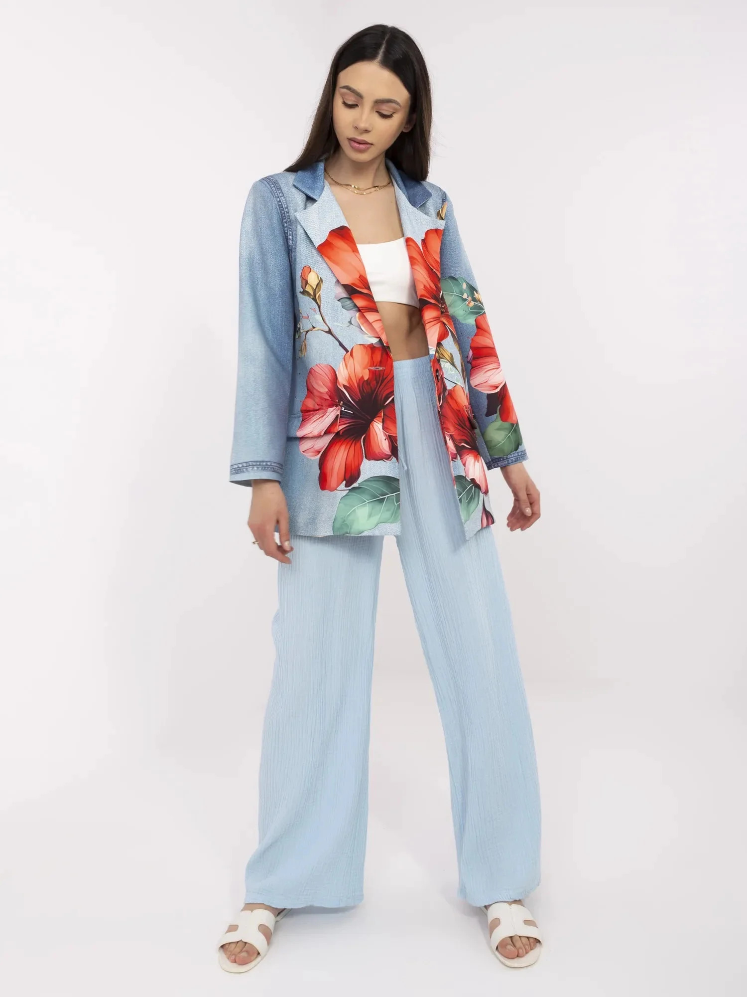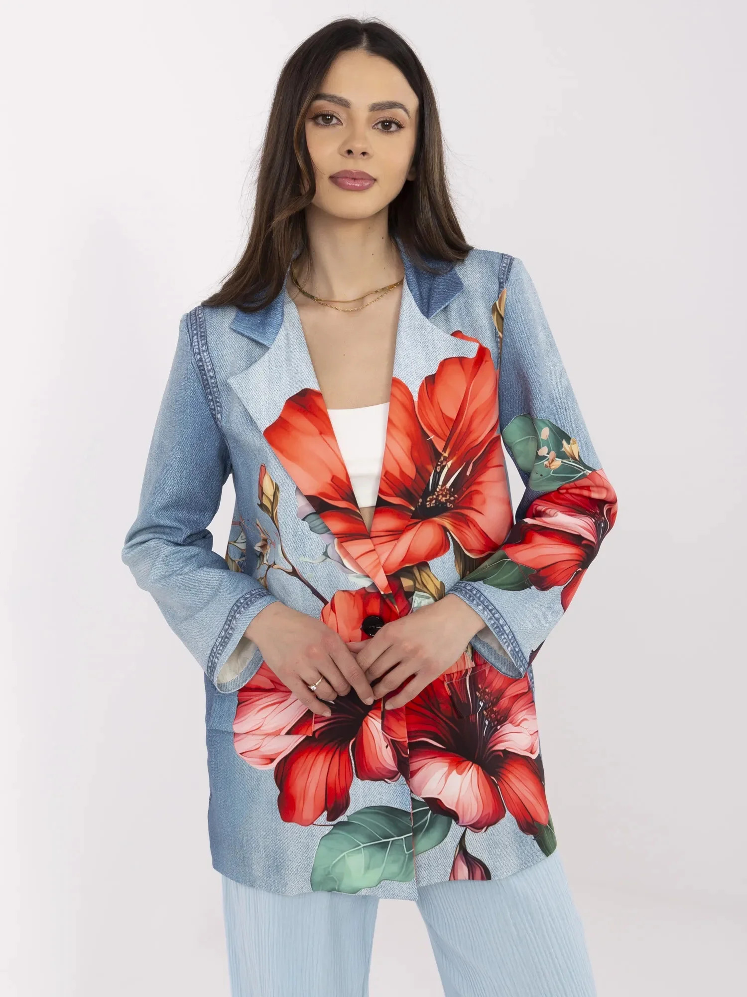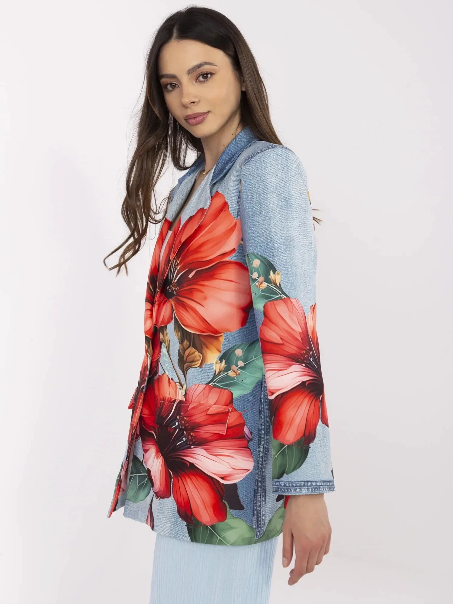 Wymiary marynarki w rozmiarze one size mierzone na płasko: szerokość pod pachami - 52 cm, długość rękawa - 59 cm (od szwu), długość całkowita - 77 cm, szerokość w biodrach - 60 cm.