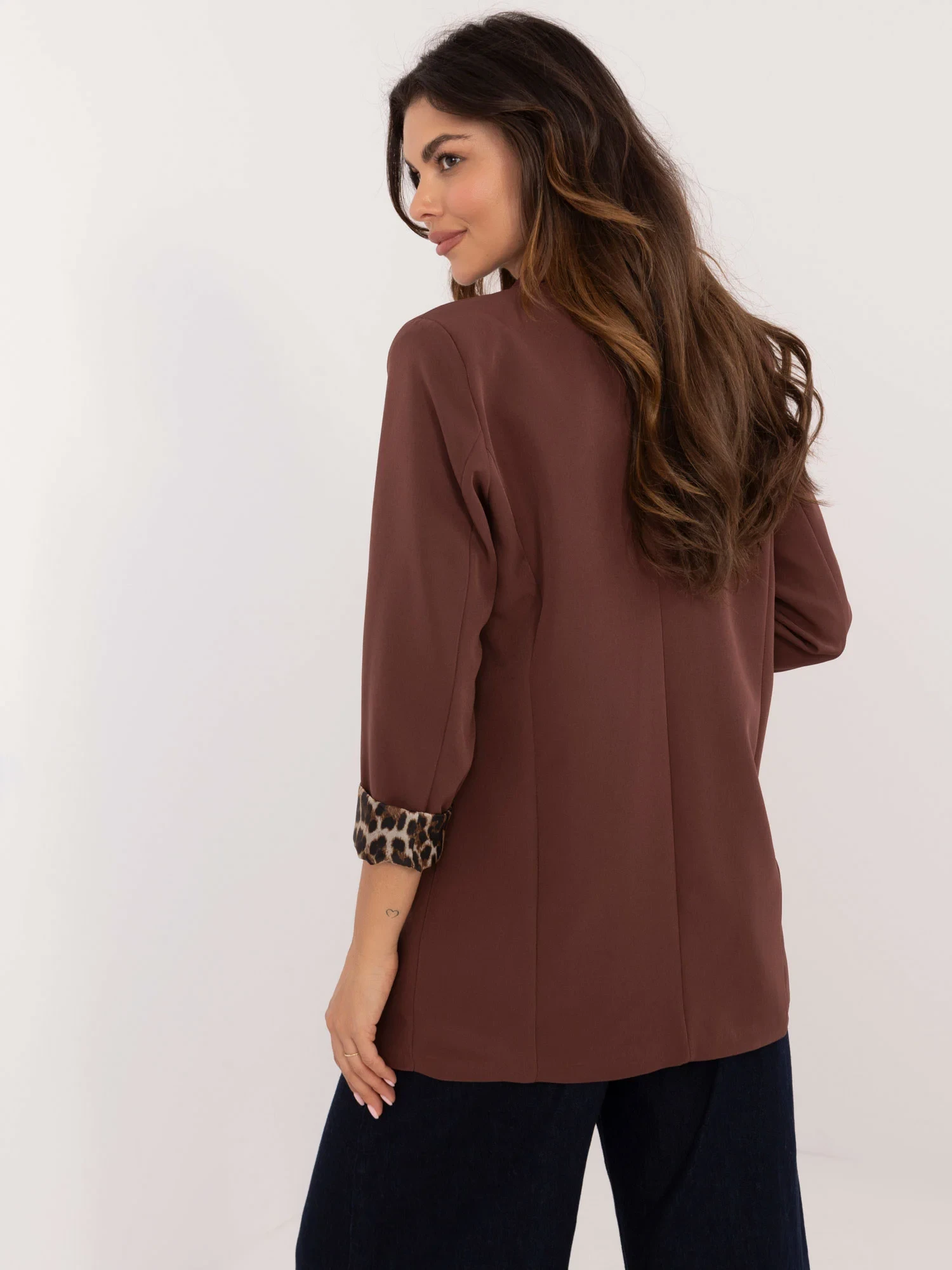 Wymiary marynarki w rozmiarze one size mierzone na płasko: szerokość pod pachami - 52 cm, długość rękawa - 56 cm, długość całkowita - 73 cm.
